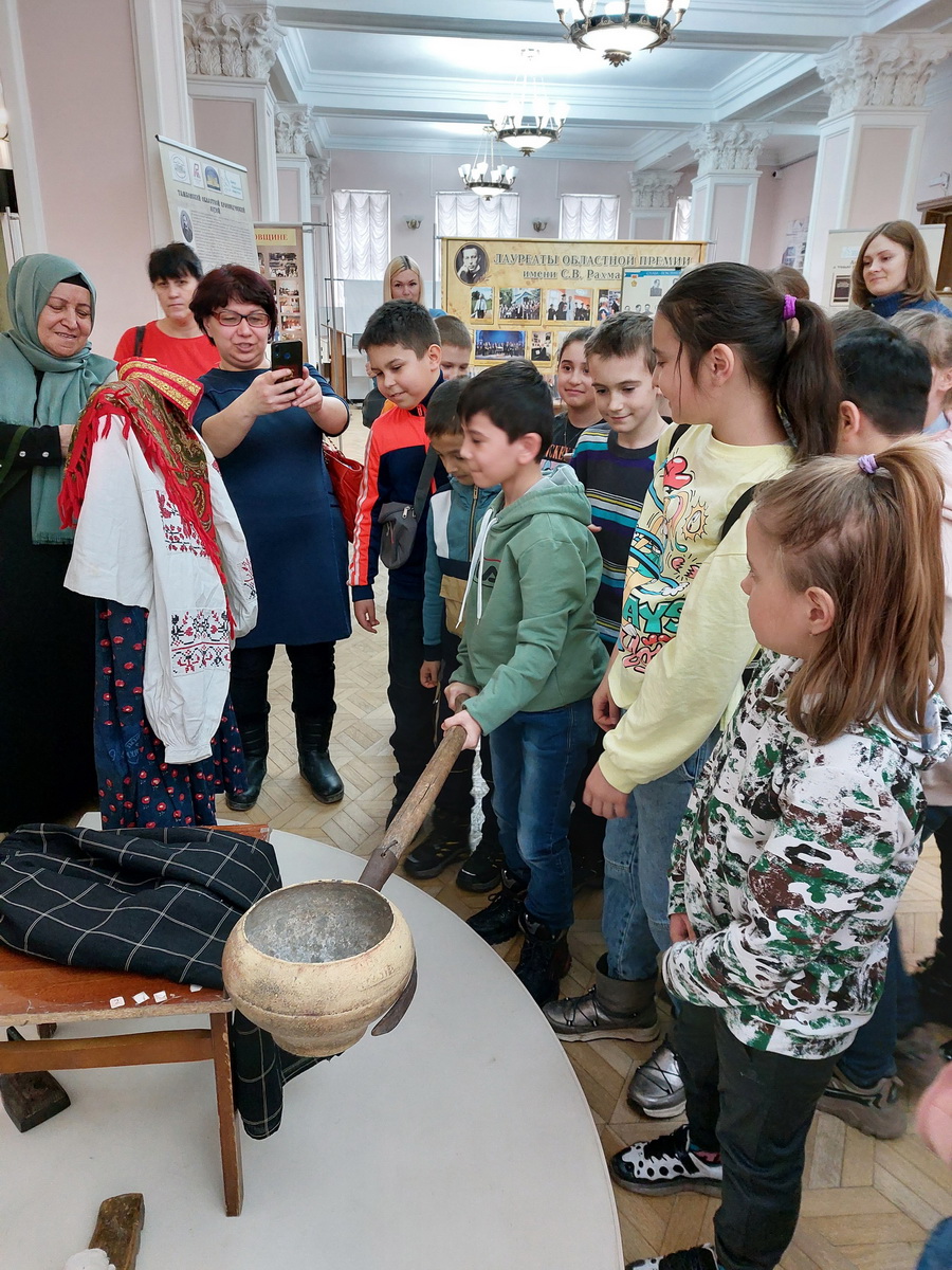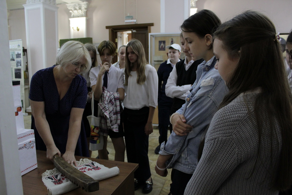 Сотрудники отдела Информационно-образовательный центр «Русский музей: виртуальный музей» познакомили школьников с тем, как одевались крестьяне в тамбовских селах конца XIX – начала XX века, какие предметы быта использовали, что готовили, как справляли свадьбы, какие промыслы были развиты. У детей была возможность попробовать погладить рубелью, примерить коромысло.
