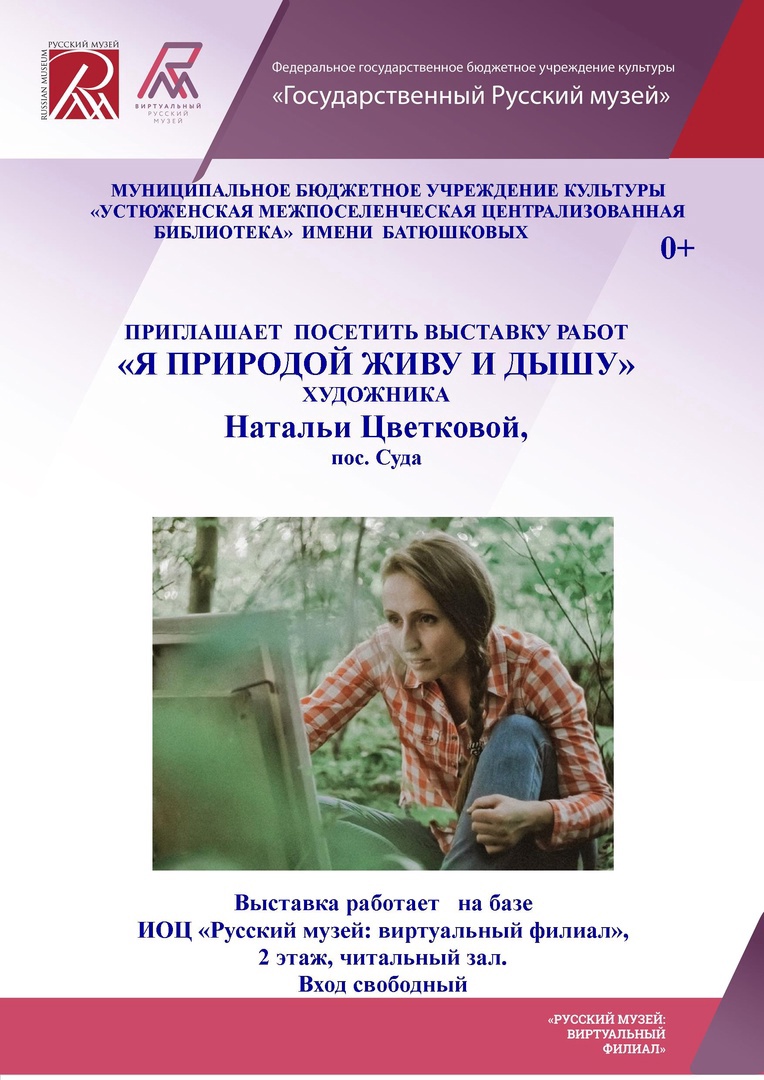 С 11 мая по 24 июня  ИОЦ "Русский музей: виртуальный филиал", расположенный на базе районной библиотеки имени Батюшковых по адресу: город Устюжна, Торговая площадь, дом 14, представляет вниманию устюжан и гостей города выставку молодого художника из поселка Суда  — Цветковой Натальи.