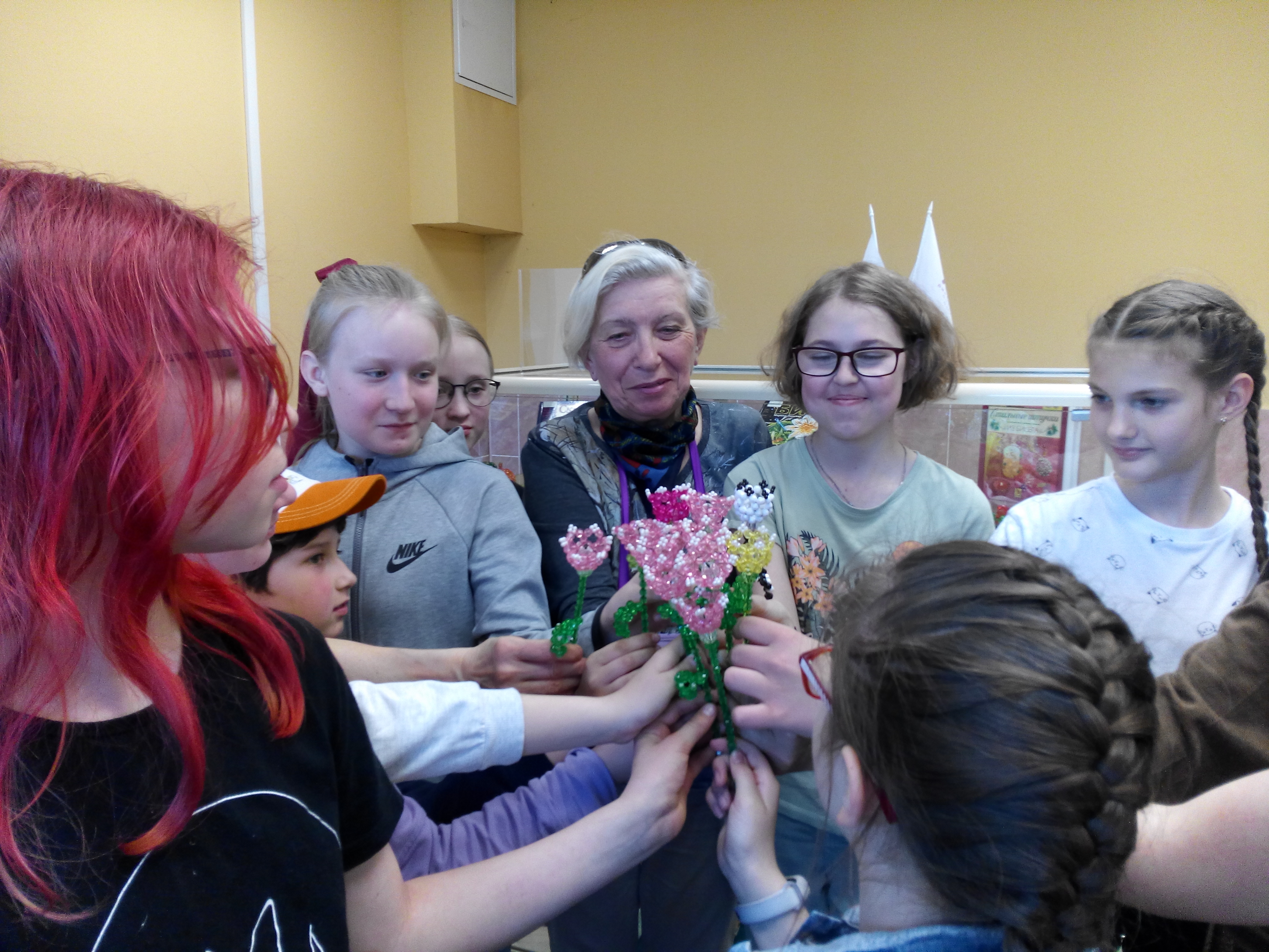 Затем состоялся урок по освоению мастерства бисероплетения, который провела педагог ПЦ «Альбатрос» Александра Михайловна Бавыкина. Результатом совместного творчества приглашенных гостей и воспитанников студии бисероплетения «Жар-птица» стал яркий, многоцветный букет, который посетители библиотеки посвятили памяти гения русской литературы – А.С. Пушкина.