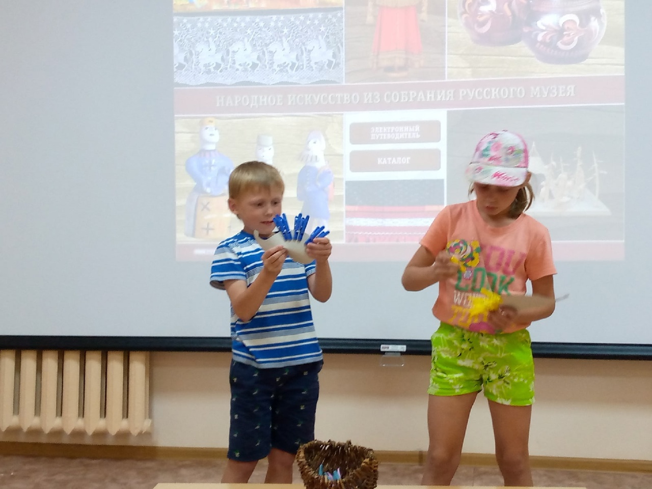 Занятие цикла мероприятий для детей младшего и среднего школьного возраста в рамках Года народного искусства и нематериального культурного наследия народов России стало итоговым. Ребята посмотрели фильм "Народное искусство" и электронный путеводитель  из медиатеки Русского музея. Во второй части занятия поиграли в игру "Чудные человечки".