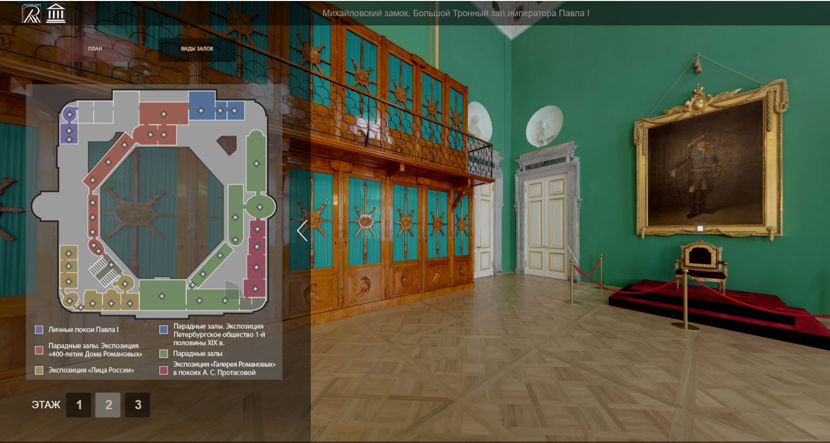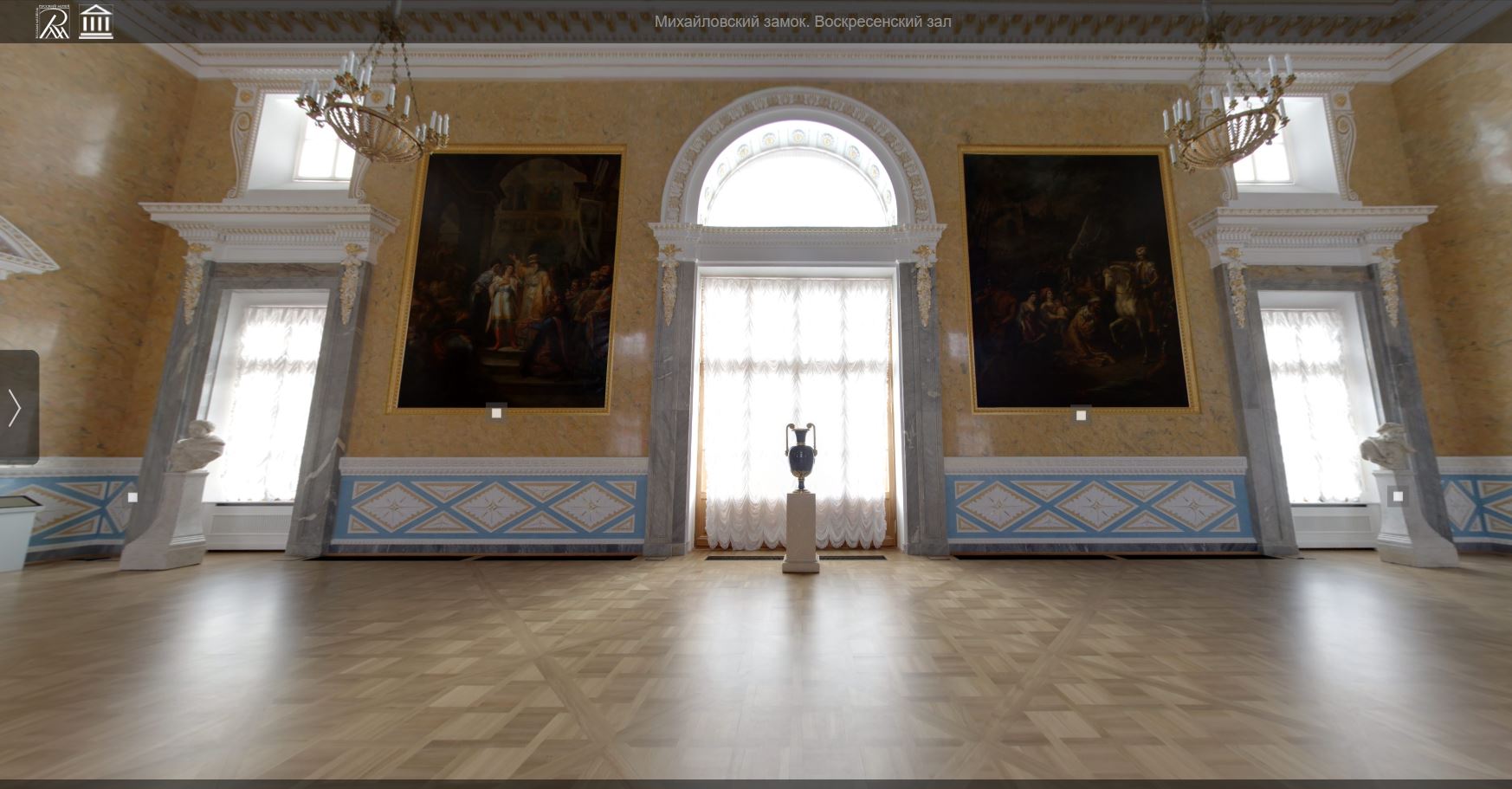 В виртуальном туре по Михайловскому замку можно также увидеть открытые после реставрации Большой Тронный зал Павла I и Воскресенский зал, куда вернулись на свое историческое место масштабные полотна Григория Угрюмова «Призвание Михаила Федоровича на царство 14 марта 1613 года» и «Взятие Казани Иваном Грозным».