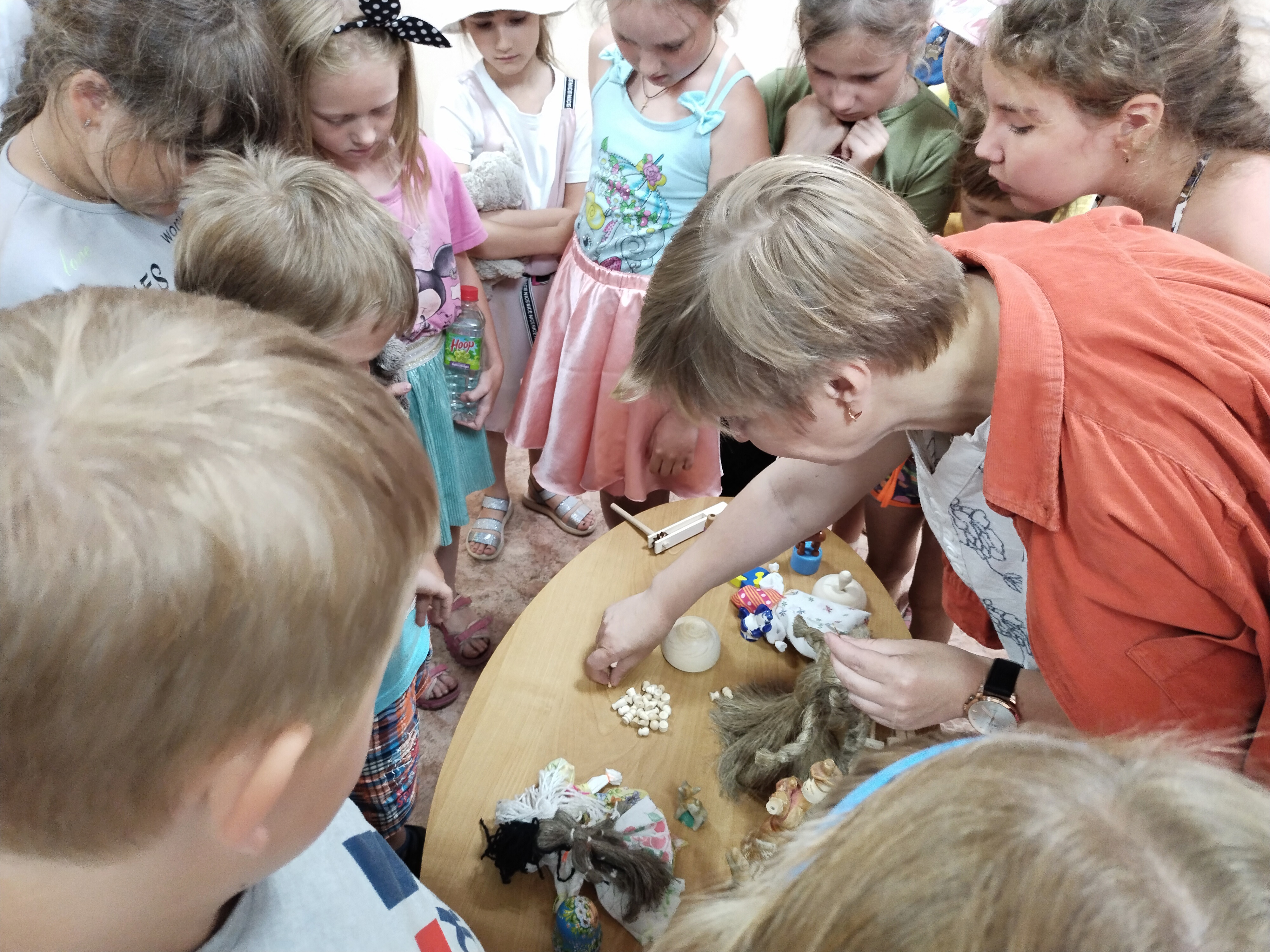 Второе занятие цикла мероприятий для детей дошкольного, младшего и среднего школьного возраста в рамках Года народного искусства и нематериального культурного наследия народов России посвящено русской игрушке. Ребята узнали, во что играли дети, их сверстники, несколько столетий назад; увидели забытые детские забавы и те, что дошли до наших дней, поговорили о превращении обычной игрушки в произведение народного промысла. На экране гости виртуального филиала увидели игрушки из коллекции Русского музея, а потрогать и поиграть можно было экспонатами Народной картинной галереи поселка Солнечный.