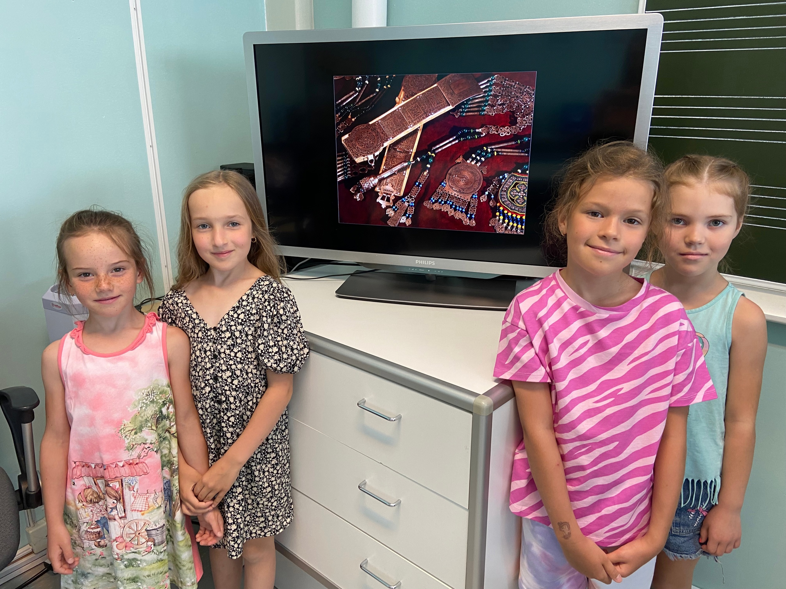 Дети ознакомились с картинами российских художников, в их числе - «Ночь» Сардааны Владимировны Ивановой, «В тундре» Иннокентия Георгиевича Избекова. Также ребята рассмотрели якутские женские украшения необычайной красоты, воспроизведённые художником Ларисой Петровной Бубякиной.
