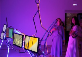 Однако, современные мультимедийные экспозиции – это не только возможность в яркой технологичной форме познакомить широкую аудиторию с музейной коллекцией и творчеством русских художников, это еще и место встречи с современным медиа искусством. Так, 60-летие покорения человеком космоса дало повод для проведения беспрецедентной цифровой акции «Посвящение космонавтике» на площадке Центра мультимедиа Русского музея в декабре 2021 – марте 2022 года, в которой приняли участие современные российские и зарубежные медиа художники. По мотивам этой акции в Кемерове, в Кузбасском центре искусств, Русский музей представил одноименную мультимедийную выставку. Учитывая особенности экспозиционного пространства и региональную составляющую, она была дополнена специально созданными для выставки техно-арт-объектами и мультимедиа контентом на основе работ Алексея Леонова – уроженца Кемеровской области – из коллекции Московского музея космонавтики.