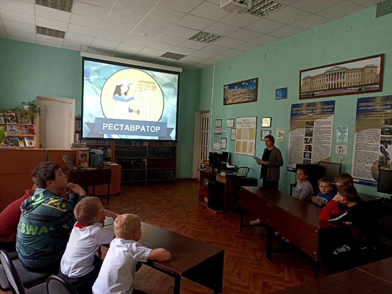 Ребята узнали, что 25 апреля 1922 года в Русском музее была открыта первая реставрационная мастерская, и познакомились с такой профессией, как реставратор. Библиотекарь Наливайко Е.А. рассказала детям, что жизнь реставратора полна эмоций и удивительных открытий. А все потому, что некоторые произведения искусства, предметы быта порой подбрасывают им головоломки и выделывают разные фокусы. То приходится заниматься «археологией», изучая слои краски на картинах или иконах, то проводить детективное расследование.