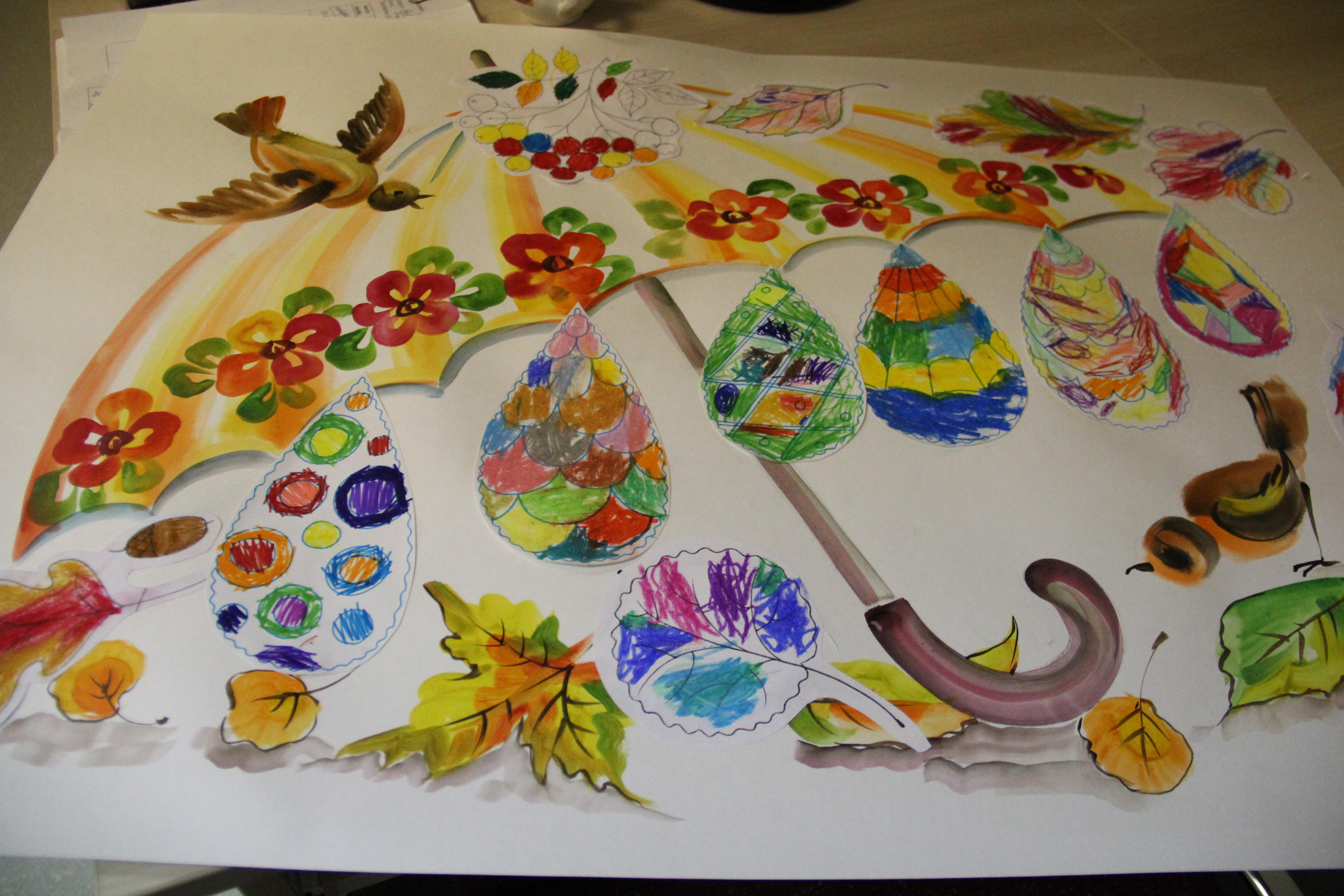 Разноцветными красками «сшили» одеяла для ежика и лисички, «заготовили» припасы для белочки и преобразили капельки осеннего дождя волшебницы осени. Отрадно, что, придя, в группу детского сада, ребята дополнили картины.