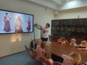Под таким названием в сентябре проходили занятия в ИОЦ "Русский музей: виртуальный филиал". Дети средних, старших и подготовительных групп познакомились с русской национальной женской одеждой.
