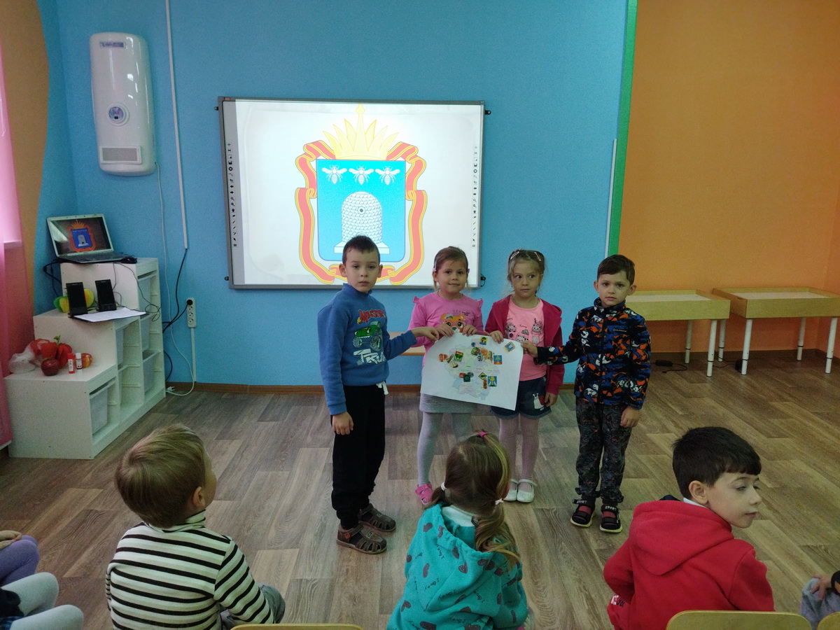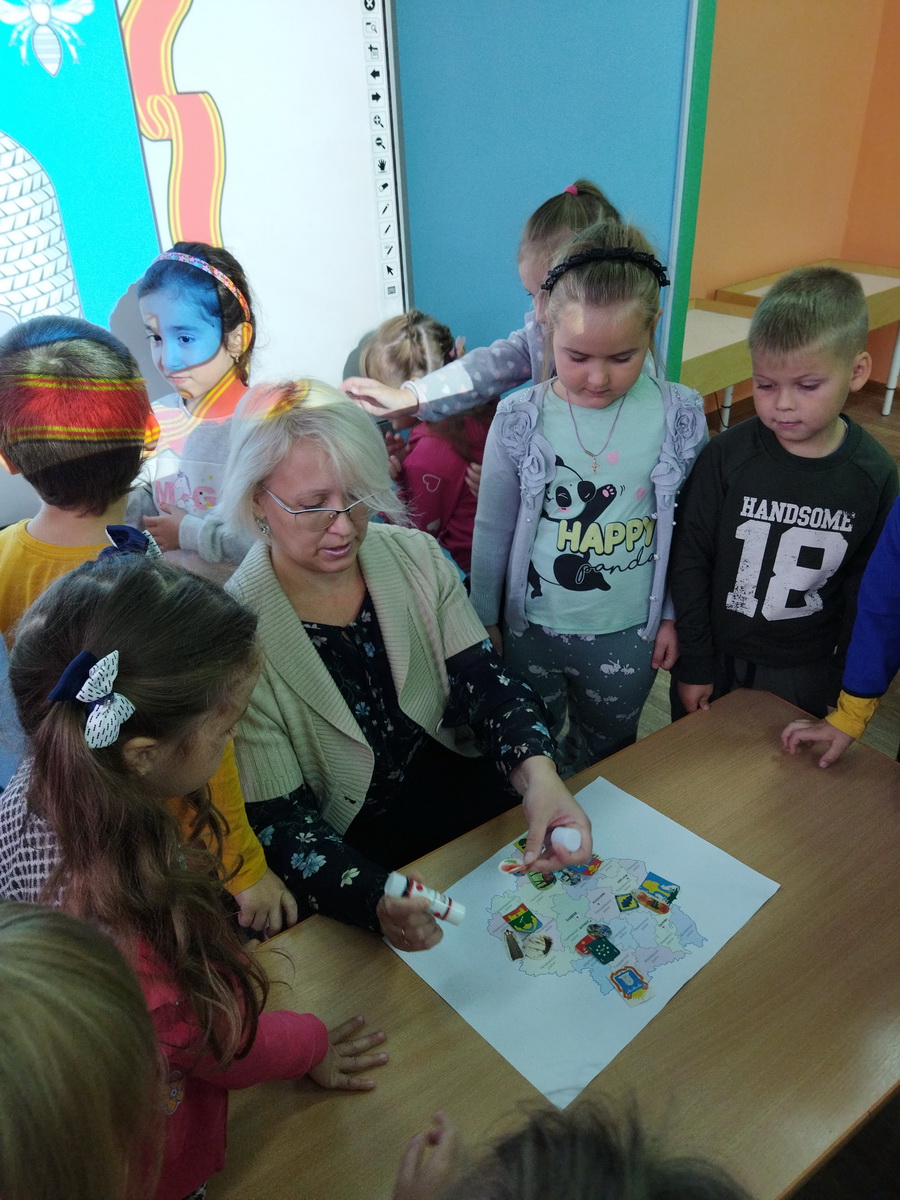 В заключении ребята отгадали недостающие элементы на гербах и наклеили на карту области все объекты, которые узнали на занятии.