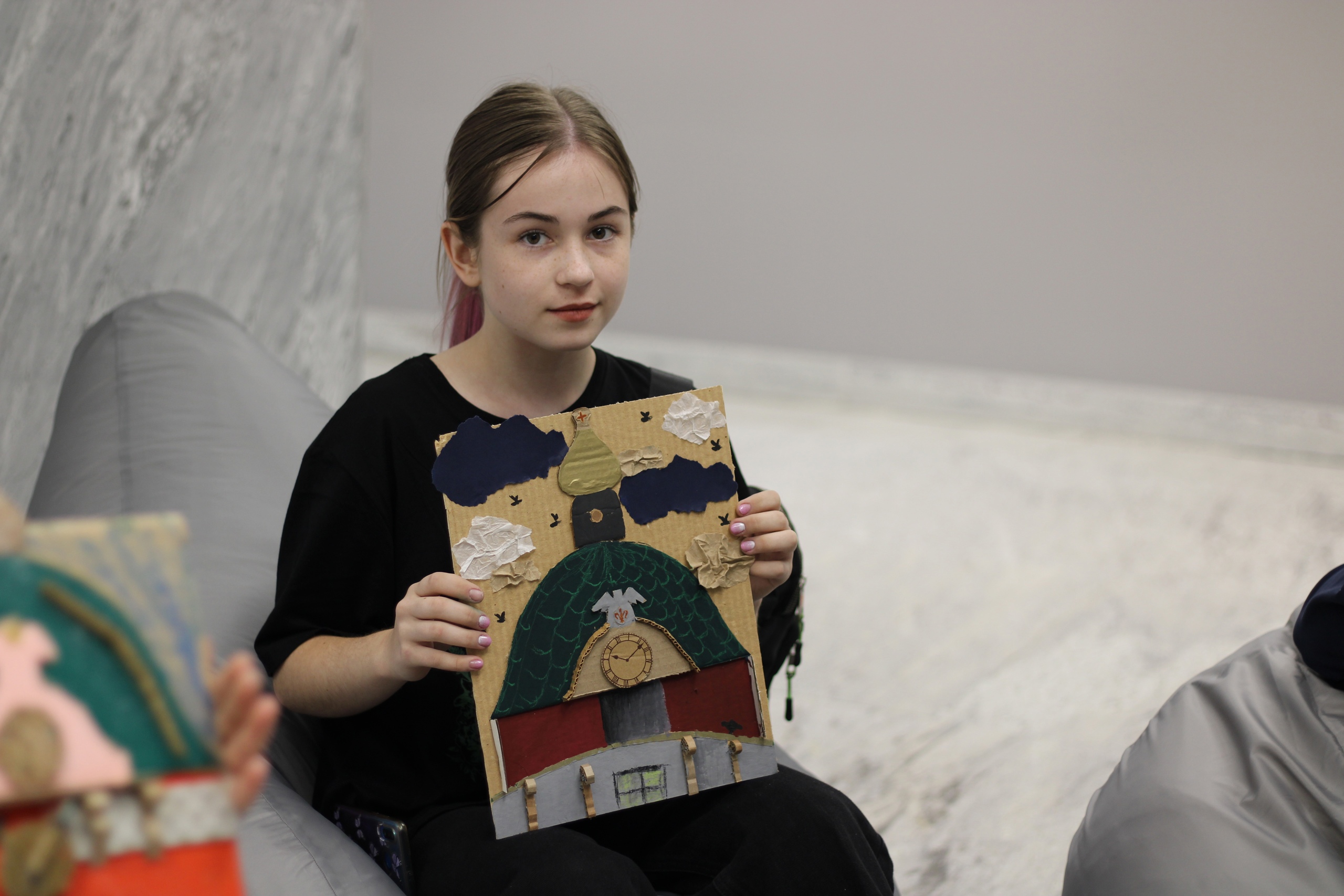 На мастер-классе мы работали в смешанной технике и изобразили одну из башенок замка. Смотрите, какие разные и классные решения! Гофрокартон, бумага, рваные и мятые кусочки, краска и фломастеры...всё получилось! Спасибо всем участникам!