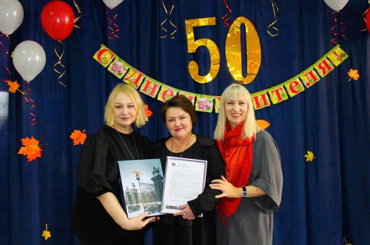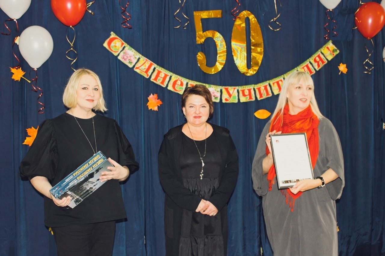 Вручили поздравительное письмо и памятный подарок директор Филиала Русского музея в г.Кемерово Е.Ю. Митрофанова и Т.В. Фролова, ведущий методист по музейно-образовательной деятельности отдела образовательных программ и практик Государственного Русского музея (Санкт-Петербург).