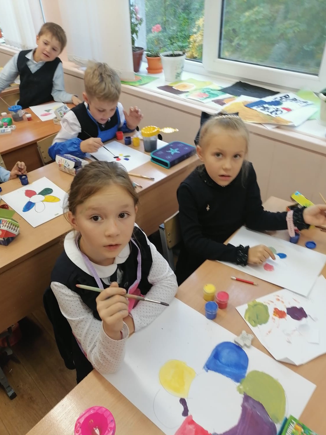 В заключение дети нарисовали волшебный цветок. Младшим школьникам очень понравилось смешивать основные краски, получая дополнительные.