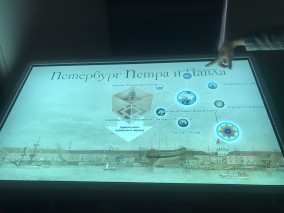 Затем мы перешли в залы истории Санкт-Петербурга, смогли перелистать страницы электронной книги, посвященной путешествию графов Северных,  выбрать на карте России памятники Петру I и ознакомиться с историей их создания, ответить на вопросы викторины, а затем посмотреть фильм в кинотеатре, работающем по советской системе «Круговой панорамы».