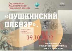 Выставка представляет работы студентов Государственного Института Кино и Телевидения. Санкт-Петербург - участников ежегодного художественного конкурса "Пушкинский Пленэр", а также работы преподавателей и руководителей участников конкурса. На выставке представлены как графические, живописные работы, а также коллажи и примеры художественной фотографии, выполненные на пленэре и в мастерских как переосмысление увиденного. Петербург, тесно связанный с пушкинской эпохой и царскосельским лицеем, воплощает в осенних золотых красках особое настроение - поэтическую пушкинскую элегию, увиденную и прочувствованную в художественном воплощении современными молодыми художниками. Именно это удивительное состояние духа и души почувствуют и посетители выставки "Пушкинский Пленэр". Работы студентов кафедры компьютерной графики и дизайна, кафедры народной художественной культуры ГИКиТ СПБ, а также работы преподавателей, доцентов кафедры компьютерной графики и дизайна, членов Санкт-Петербургского Союза художников И.В.Несветайло, М.А. Нестеровой, а также доцента кафедры филологии и истории искусств, члена Санкт-Петербургского Союза художников И.Е.Конькова отражают современное видение не только города и петербургских художественных традиций, но и насыщены мотивами и образами пушкинских произведений и эпохи золотого века русской поэзии.