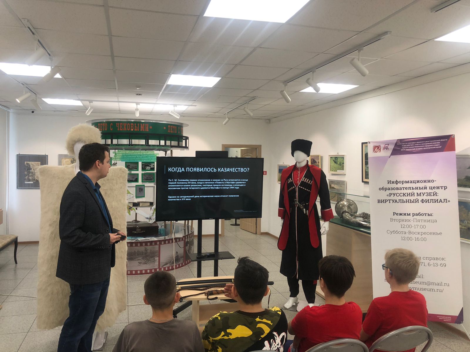 Используя медиатеку информационно-образовательного центра «Русский музей: виртуальный филиал», на примере шедевров из коллекции музея, участникам показали, насколько глубоко отражена история русского казачества в живописи. Присутствующие рассмотрели литографии художников Виктóра «Сражение при Бородине 26 августа 1812 года» и Ф.-Ж. Дюпрессуара «Переход французской армии через Березину в 1812 году», знаменитое полотно И.Е. Репина «Запорожцы», которые в полной мере передают дух казачьей вольницы и виртуозное живописное мастерство художников.
