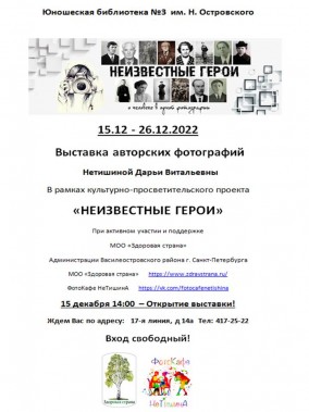 ”Неизвестные герои” - выставка авторских фотографий Нетишиной Дарьи Витальевны