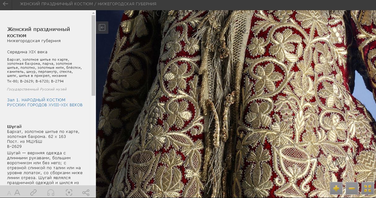 Свободно перемещаясь в пространстве выставки по точкам навигации в залах или используя наглядный план экспозиции, пользователи сети Интернет смогут увидеть народные костюмы русских городов и Русского Севера, свадебные костюмы и костюмы Средней и Южной России. В виртуальном туре можно будет детально рассмотреть каждый костюм, снятый в высоком качестве, прочитать подробные аннотации, подготовленные сотрудниками отдела народного искусства Русского музея, узнать, из каких элементов состоял костюм в той или иной местности, какие были особенности головных уборов и какие украшения носили женщины в разных губерниях, а также послушать аудиогиды о наиболее интересных экспонатах и познакомиться с лекциями, которые были подготовлены к данной выставке.