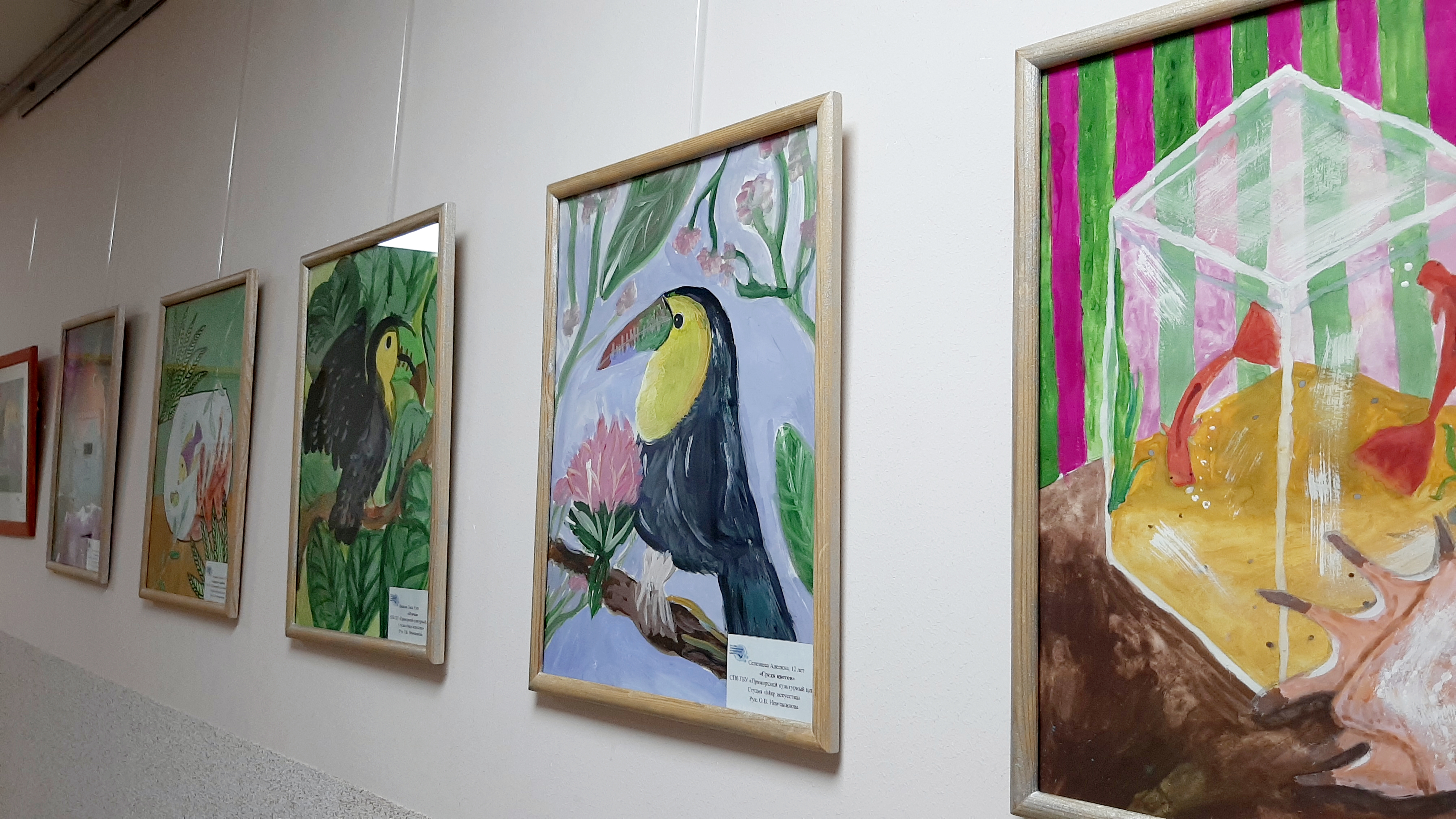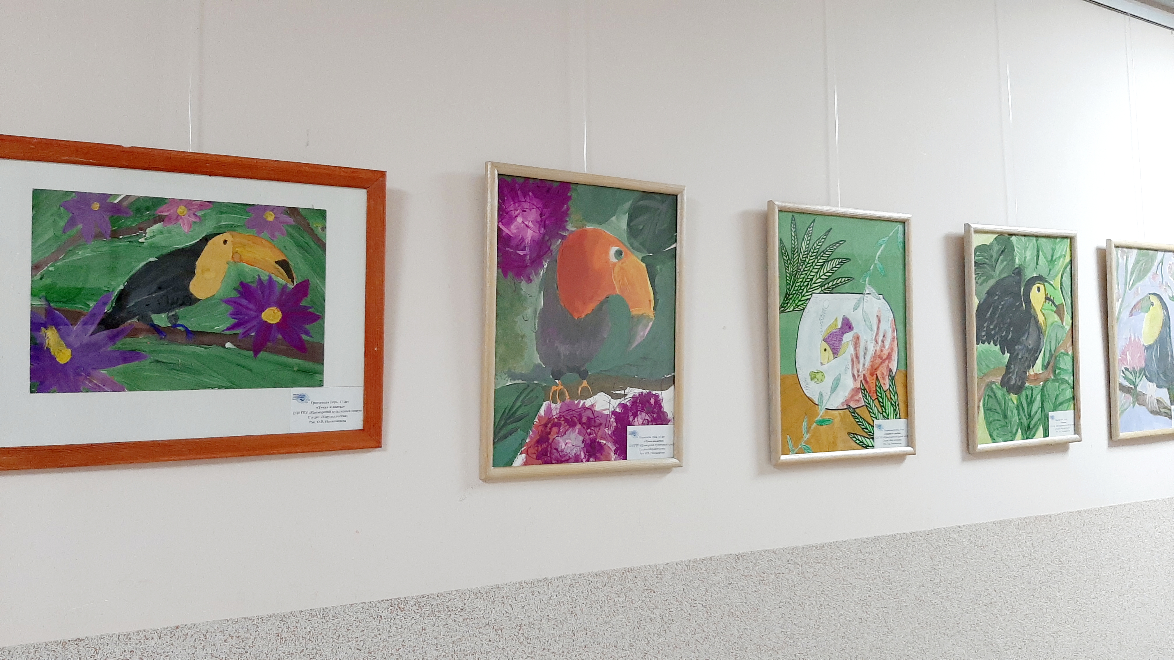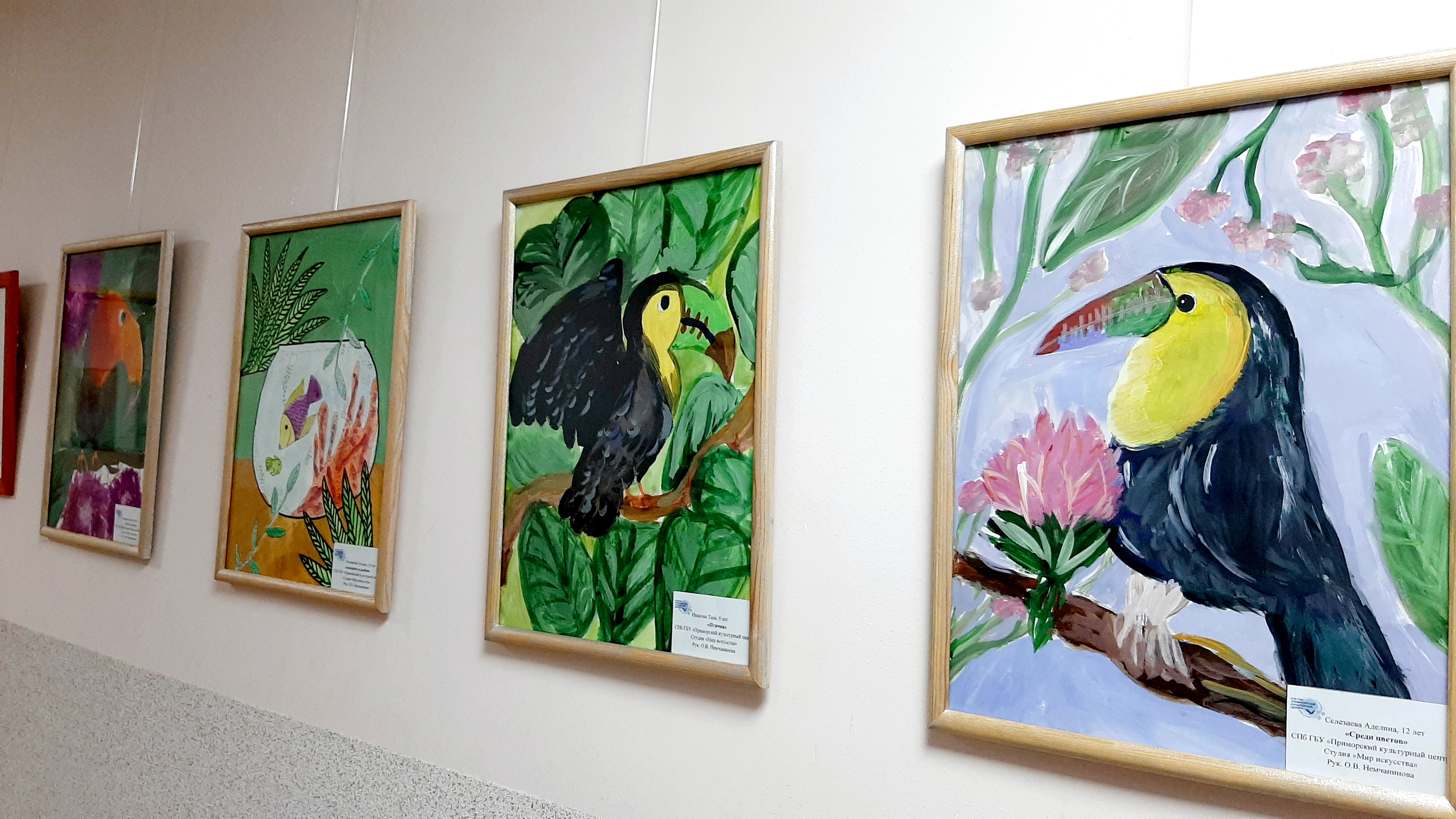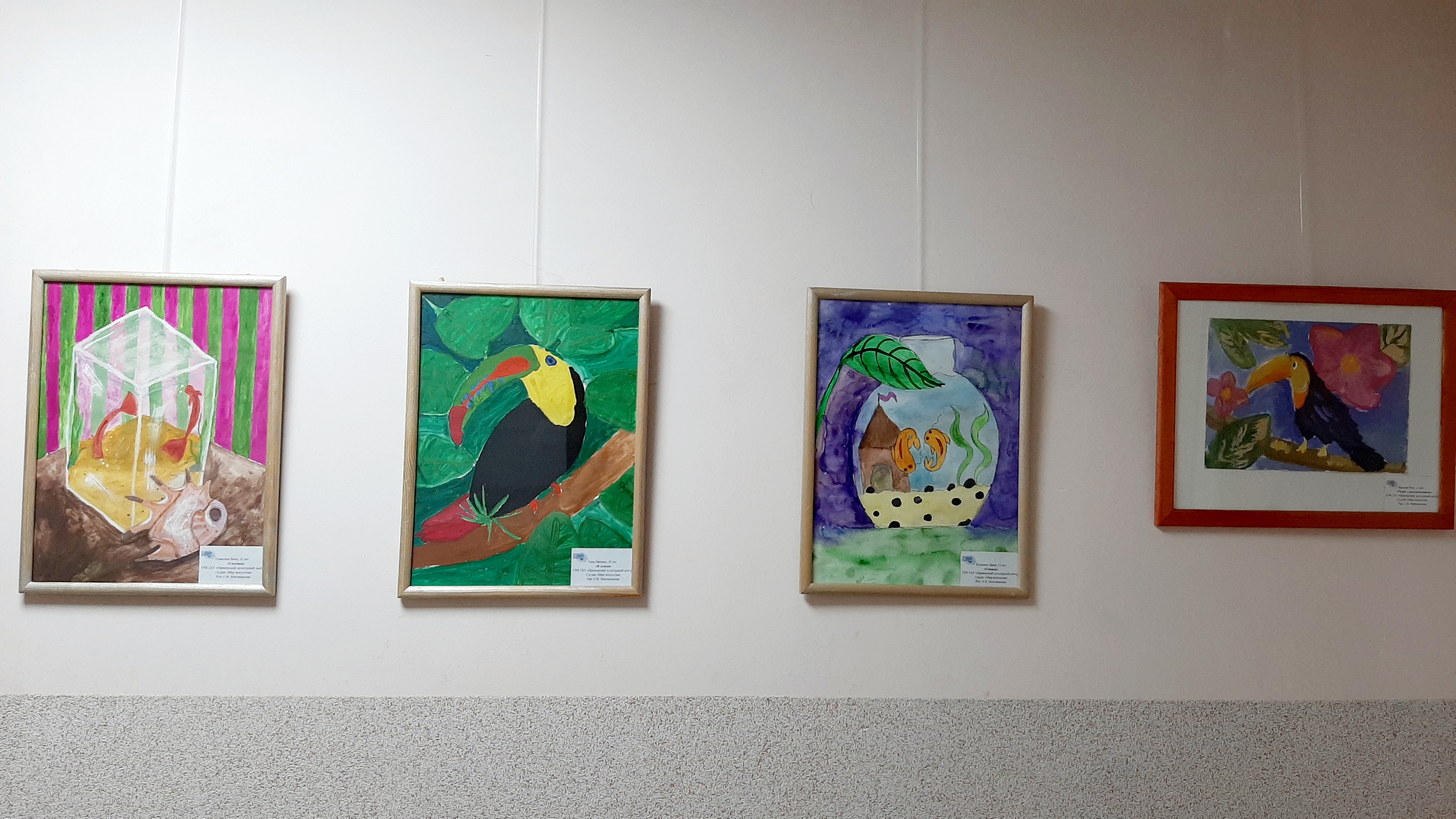 В декабре прошла выставка рисунков детской студии "Мир искусства", которая называлась "По следам фовистов". Основным мотивом было изображение экзотических птиц - туканов и аквариумов с рыбками. Яркие цвета, локальные пятна, крупные формы - главные художественные стедства в работах детей, продемонстрированных на выставке.
