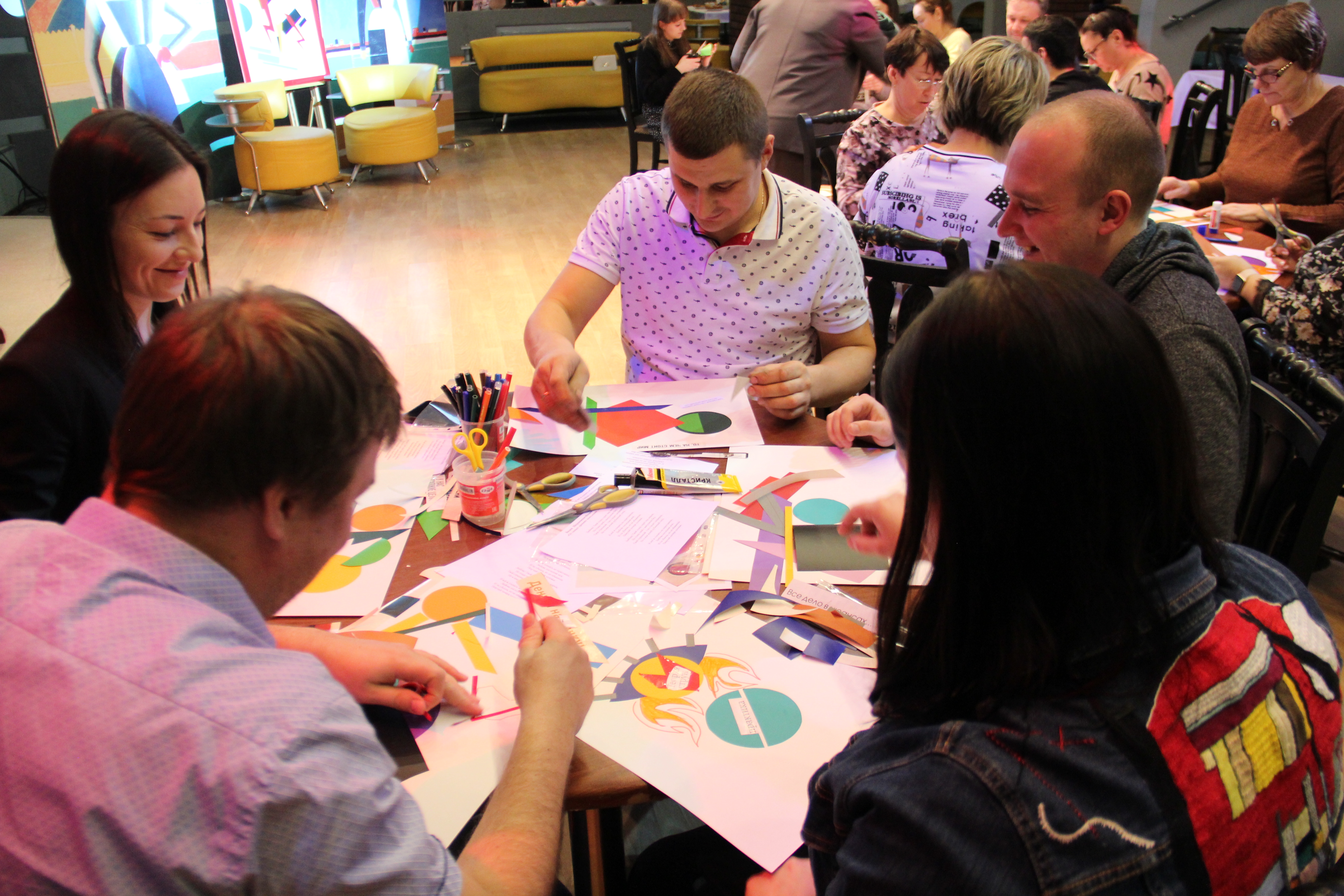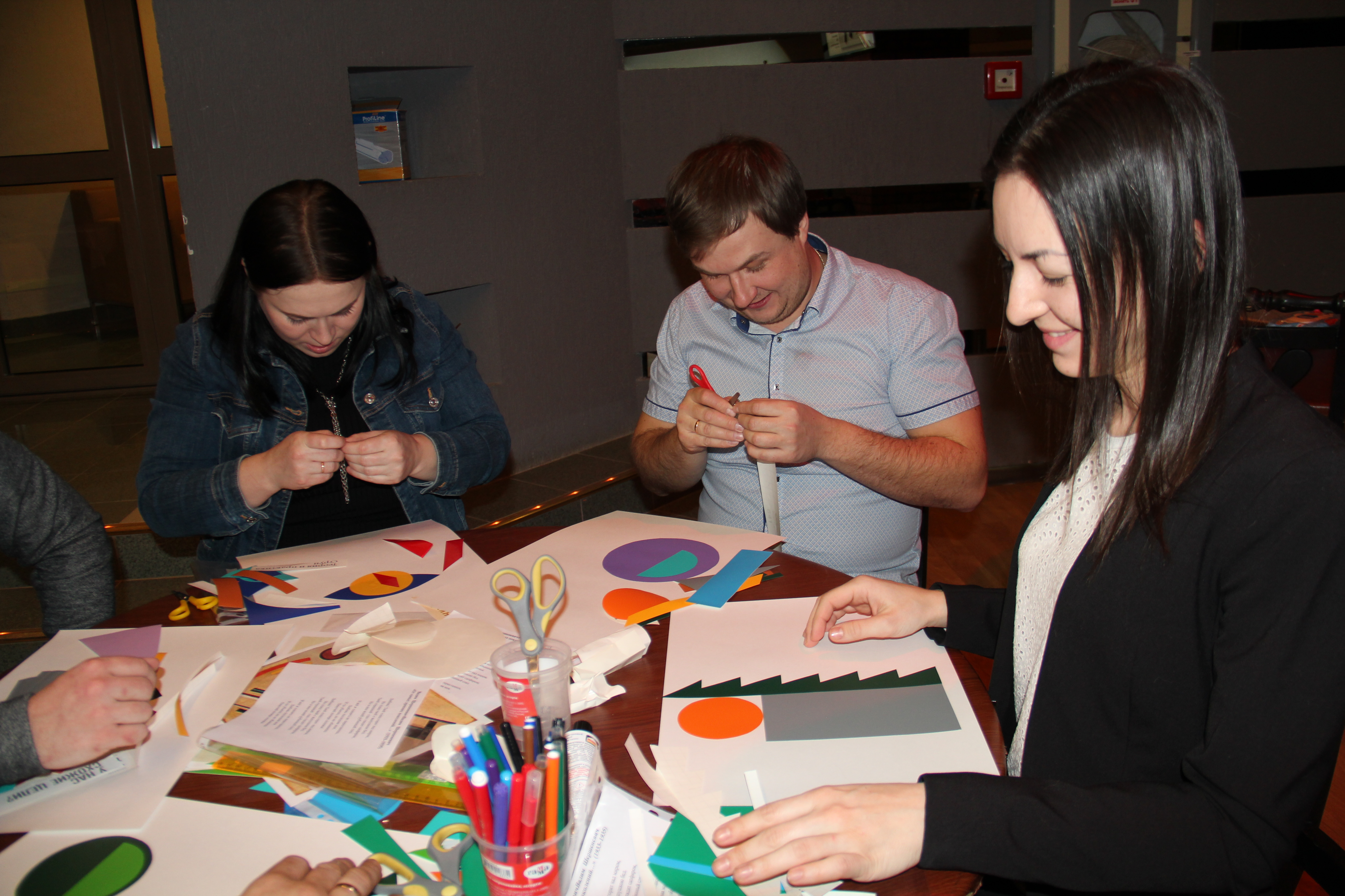 Наши участники предстали в роли художников-новаторов. Придумали название своего  художественного объединения и  совместно представили  выставку готовых работ. Композиции из предложенных  геометрических фигур получились разные, яркие и динамичные. К выполнению задания все отнеслись творчески.