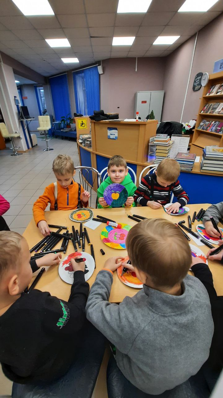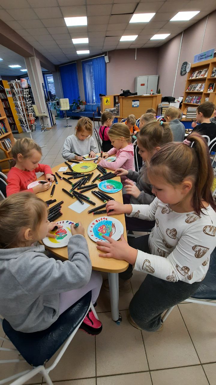 На мастер-классе дети оформили тарелочки в смешанной технике и увидели книги с изображением героев русских былин и сказок в искусстве.