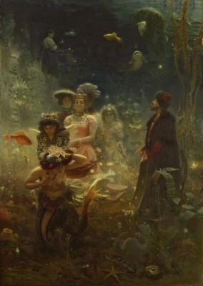 Ребята посмотрели фильм из цикла "Сказки о русских художниках" из медиатеки Русского музея, рассмотрели и обсудили картину "Садко", написанную мастером. Маленькие посетители уже изучали сказочно-былинный жанр, поэтому легко вспомнили работы Виктора Васнецова - живописца, любившего эту тему.