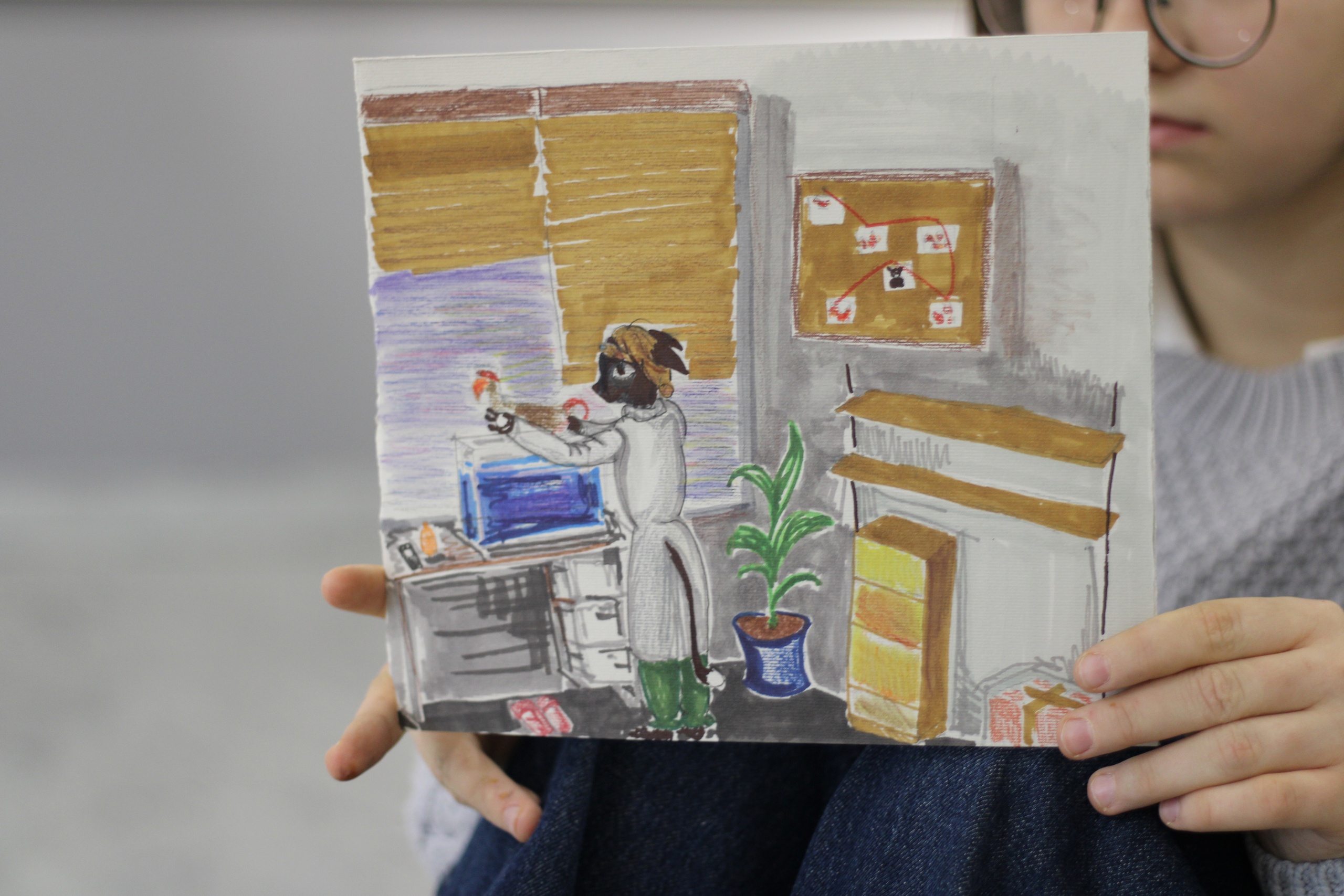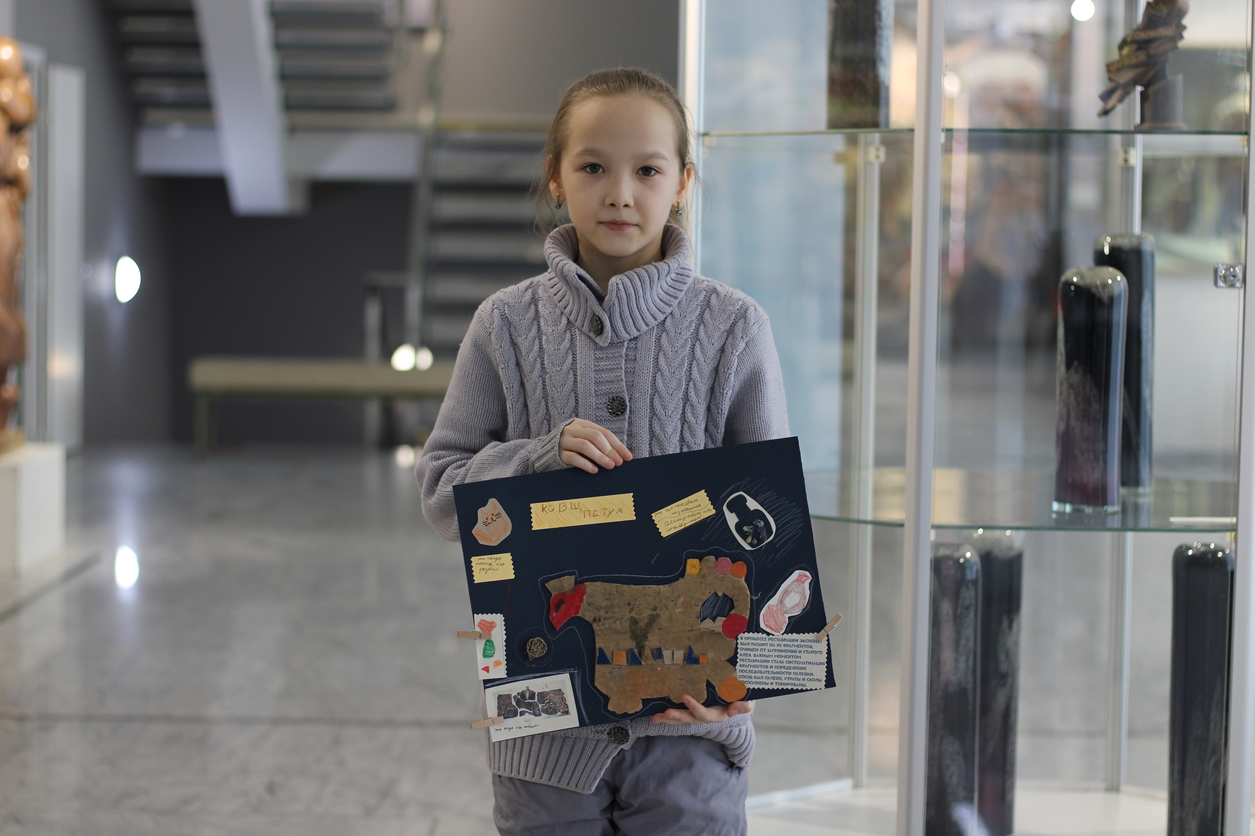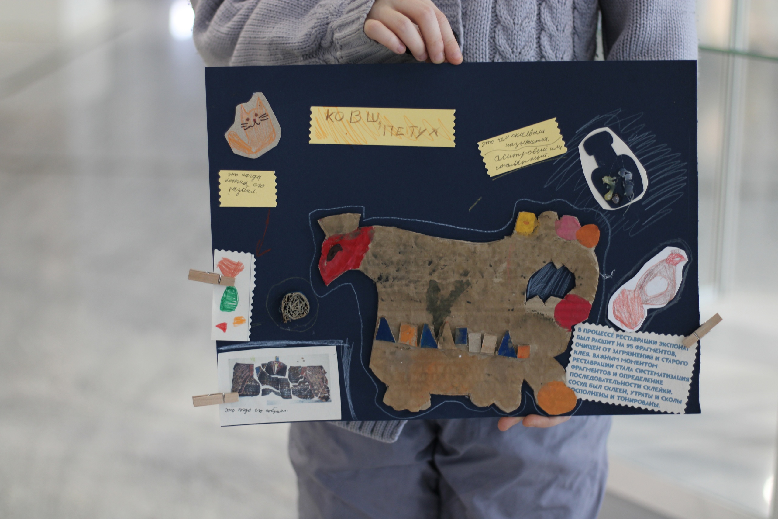 На мастер-классе ребята оформляли свои впечатления в рисунок или коллаж с заметками о реставрации. В ряде работ можно заметить комикс о бытовании сосуда в домашних условиях и его последующей реставрации. В коллажах ребят можно заметить фигурку сосуда в технике многослойной аппликации из картона и бумаги, рисунки баночек с пигментами и имитацией столярного клея. Ещё есть классная идея с котом реставратором, есть акварель, вдохновлённая фотографиями с портала «Служба реставрации музейных ценностей» и целый макет мастерской тоже придумался!