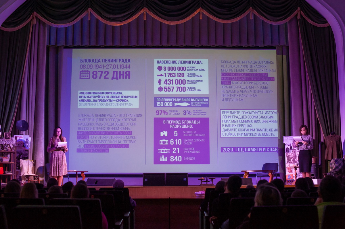 Погрузиться в атмосферу блокадного Ленинграда участникам помогли кадры из документального фильма «Дорога 101», работы художников виртуальной выставки живописи и графики Русского музея «Да будет мерой чести Ленинград». На сцене мультимедийного кинотеатра были воссозданы интерьеры комнаты во время блокады при помощи предметов из фондов Тамбовского областного краеведческого музея. Участники урока смогли увидеть фрагменты фильмов, созданных сотрудниками Русского музея: «Алексей Пахомов. История создания эстампа «В детском доме», «Атлас переливания крови», а также услышать стихотворение Ольги Берггольц «Да будет мерой чести Ленинград!», которое сопровождалось фотографиями возвращения экспонатов в Русский музей.