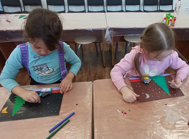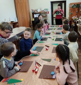 Дошкольники отгадывали загадки и слушали стихотворения о зиме, а потом выполнили аппликативное панно.
