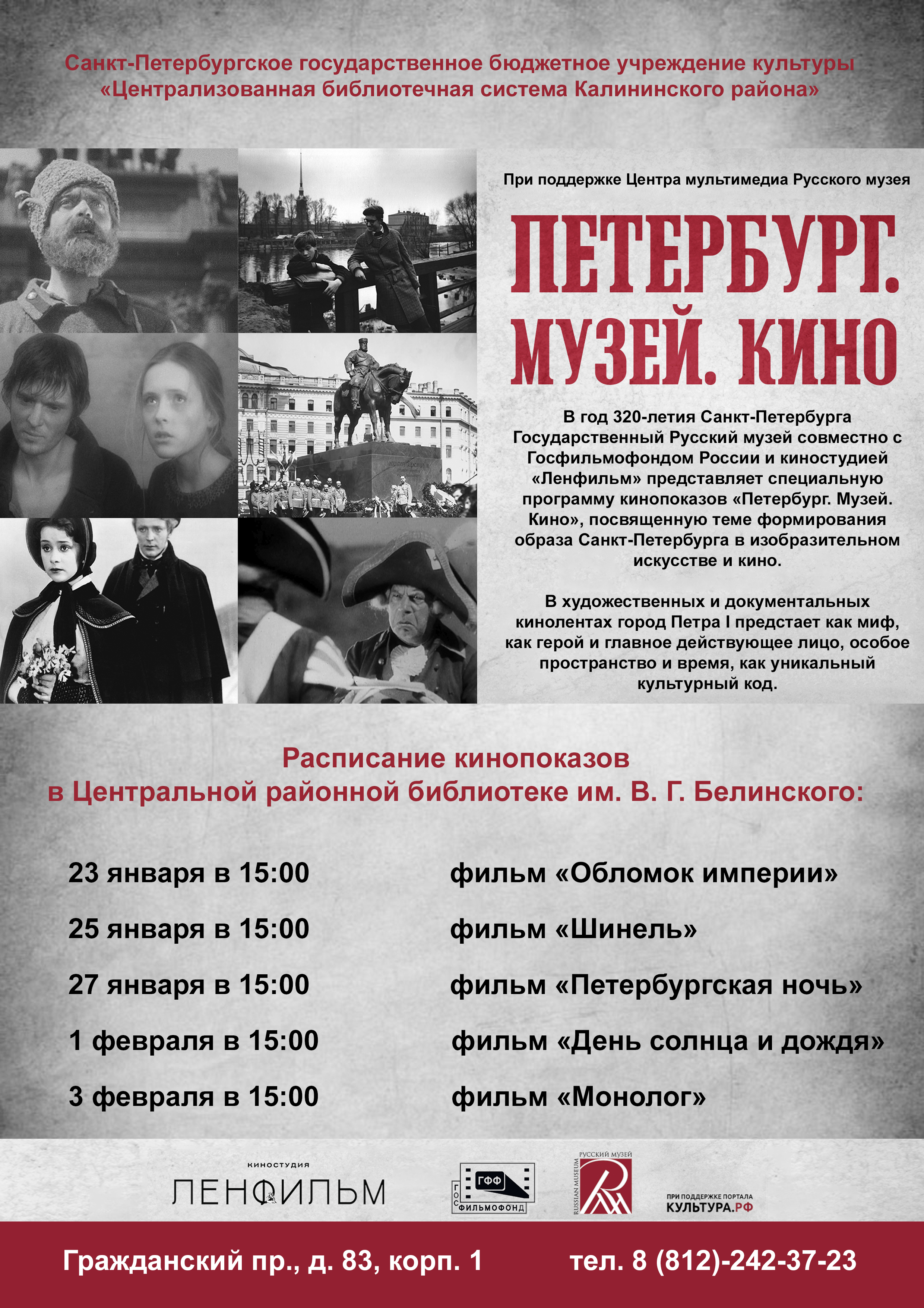 С 23 января по 18 февраля 2023 года при поддержке Центра мультимедиа Русского музея на площадках библиотек-филиалов Централизованной библиотечной системы Калининского района прошли кинопоказы в рамках программы «Петербург. Музей. Кино», посвященной теме формирования образа Санкт-Петербурга в изобразительном искусстве и кино.