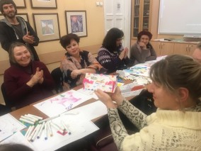 Началось занятие с проверки знаний, ведь самая первая встреча была посвящена в целом жизни художника и его творчеству. Затем, пройдя по виртуальной выставке "Казимир Малевич", участники посмотрели отрывок из оперы "Победа над солнцем", где художник впервые обратился к форме "черного квадрата".