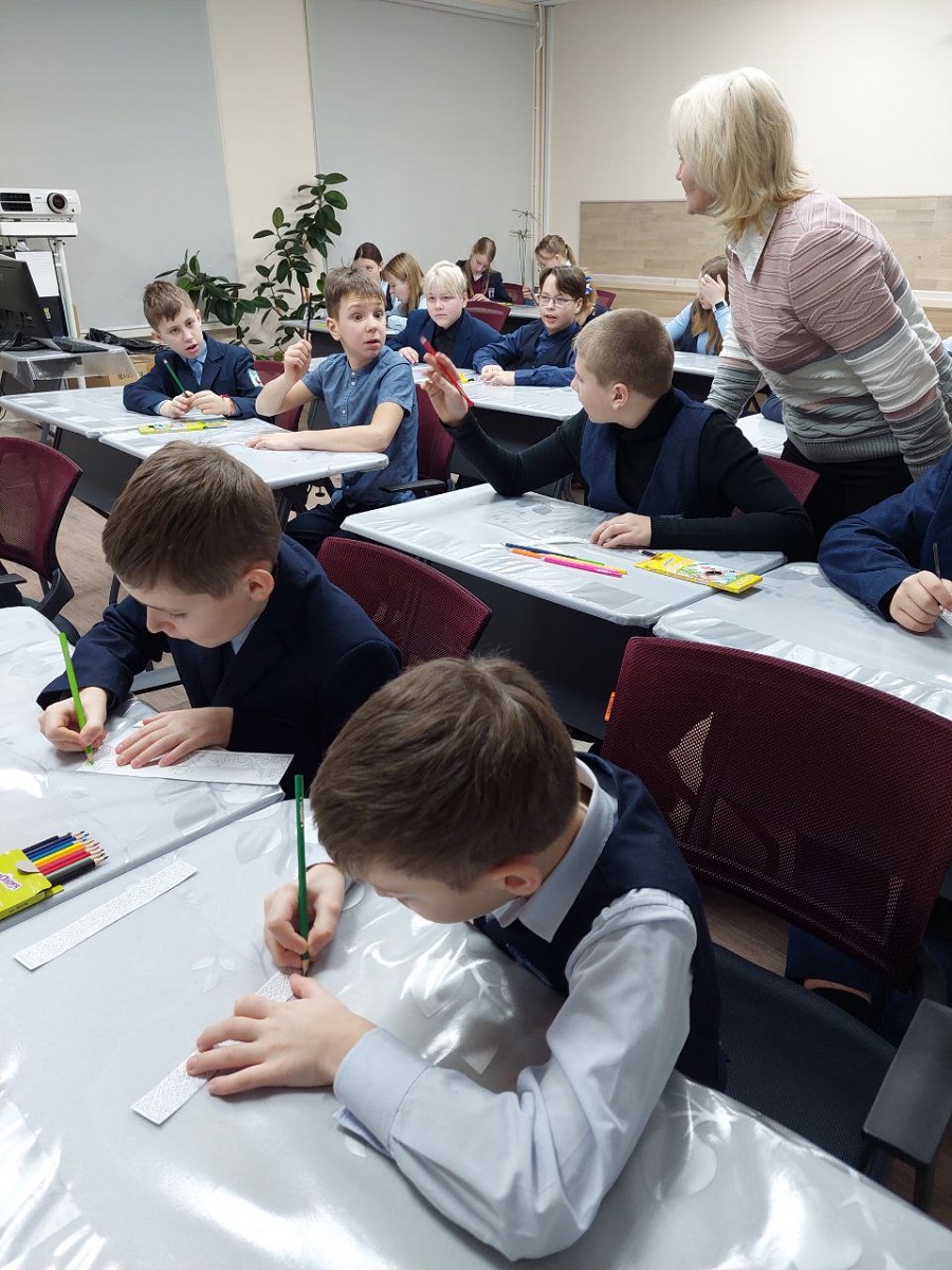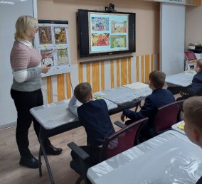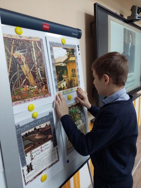 Увлечённо ребята слушали о том, как художник создавал на бумаге не отдельные иллюстрации, а целый ансамбль: обложку, орнамент, шрифт, стилизованный под старинную рукопись. Ребята узнали новые интересные понятия: заставка, виньетка, славянская вязь, билибинский стиль.