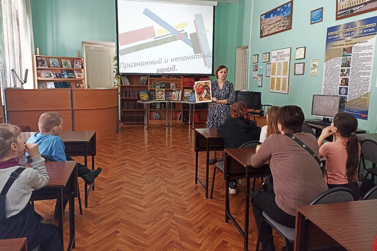 Сегодня в Пикалевской центральной библиотеке в рамках абонемента «Шаг в искусство» для детей ЛОГАУ КЦСОН прошёл арт-час «Признанный и непонятный гений», который был посвящен удивительному художнику Казимиру Малевичу.
