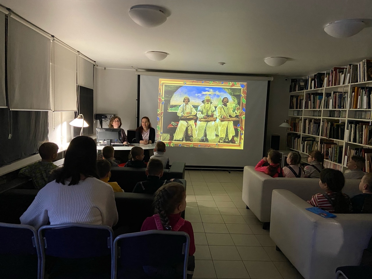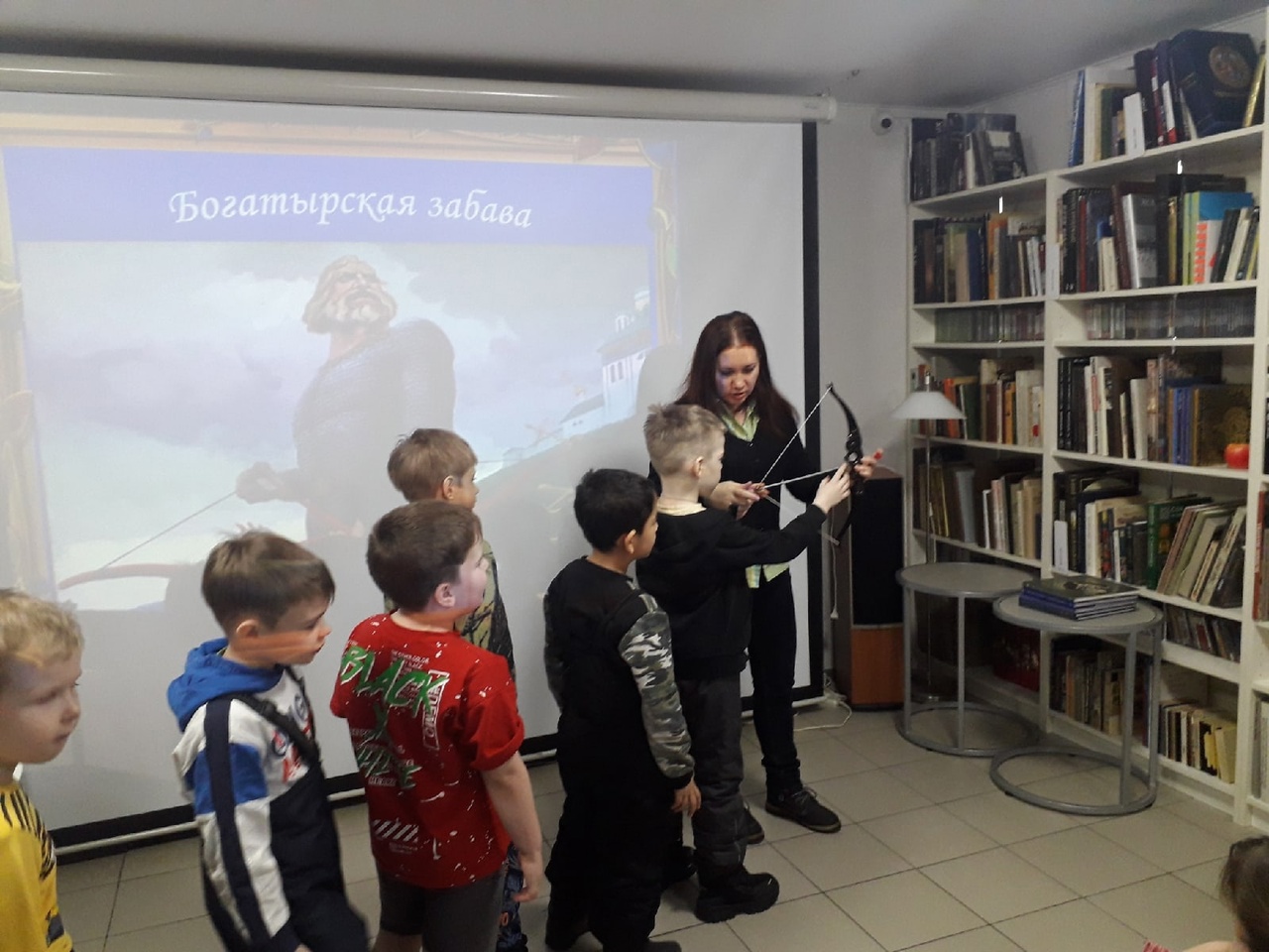 В преддверии праздника добрые молодцы да красные девицы вспоминали былины и сказки народные, а также дела ратные первых защитников Отечества - богатырей русских. Узнали о снаряжении богатырском, показывали свою меткость в стрельбе из лука, отгадывали старинные русские загадки. А также познакомились с самым "богатырским" художником - Виктором Васнецовым и отправились в страну музеев вместе с Фафалей, чтобы услышать сказку о нем.