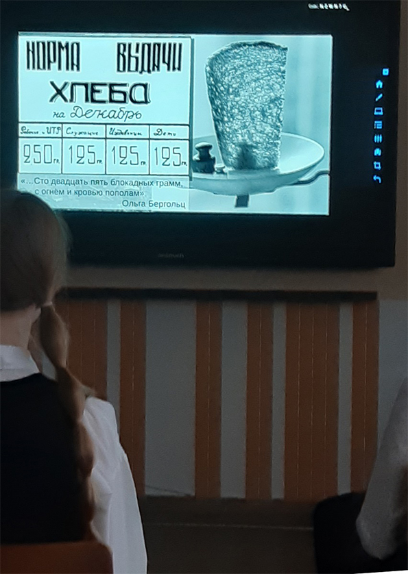 Большое впечатление на детей произвел рассказ о том, что значили в то время хлебные карточки.   Для того, чтобы посетители воочию увидели норму суточного хлебного пайка, была создана инсталляция "Блокадный хлеб - 125 граммов". Ребята, затаив дыхание смотрели видеофильм "Корочка хлеба. История одной ленинградской девочки" с воспоминаниями жительницы Ленинграда, пережившей блокаду, будучи ребёнком.