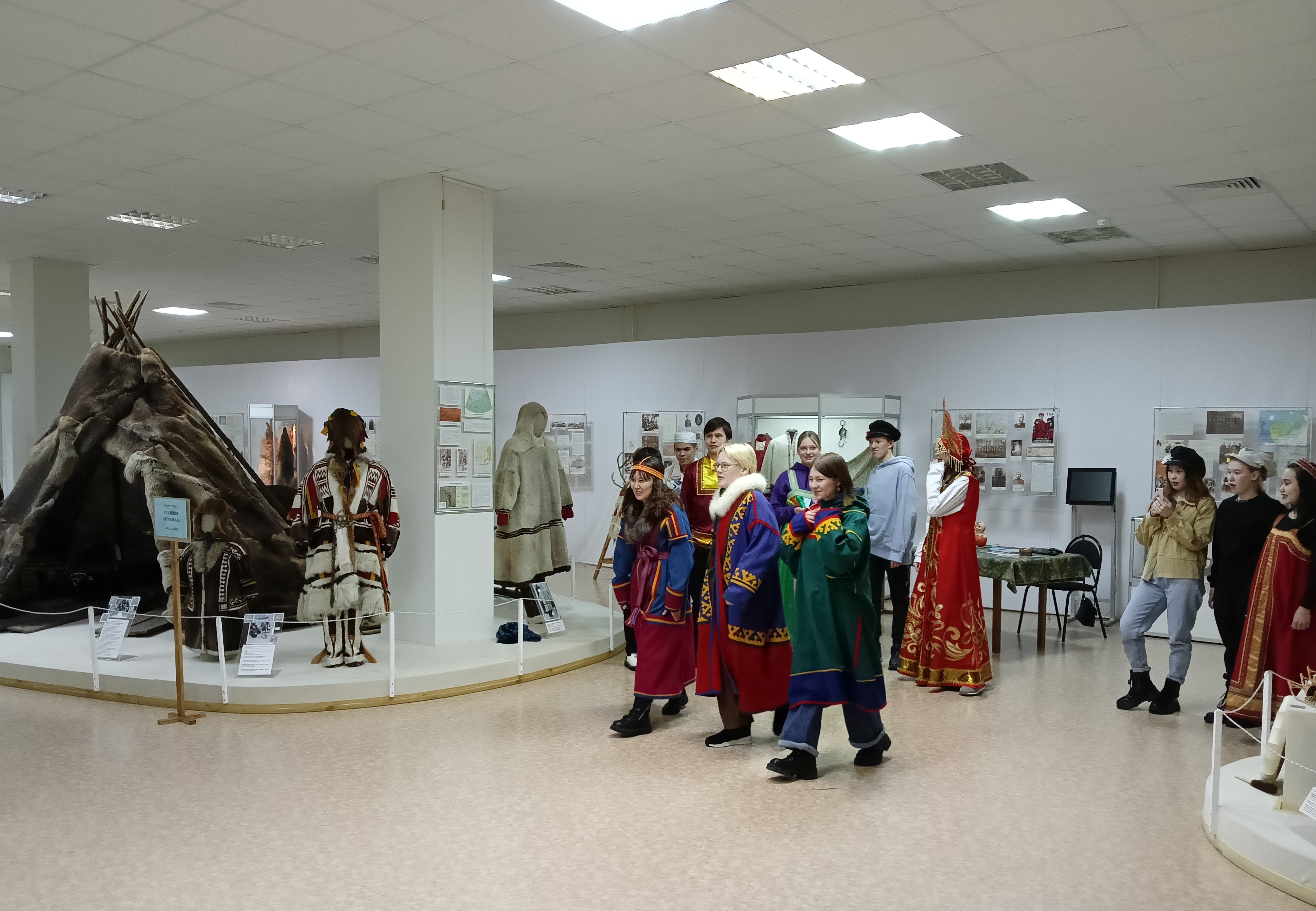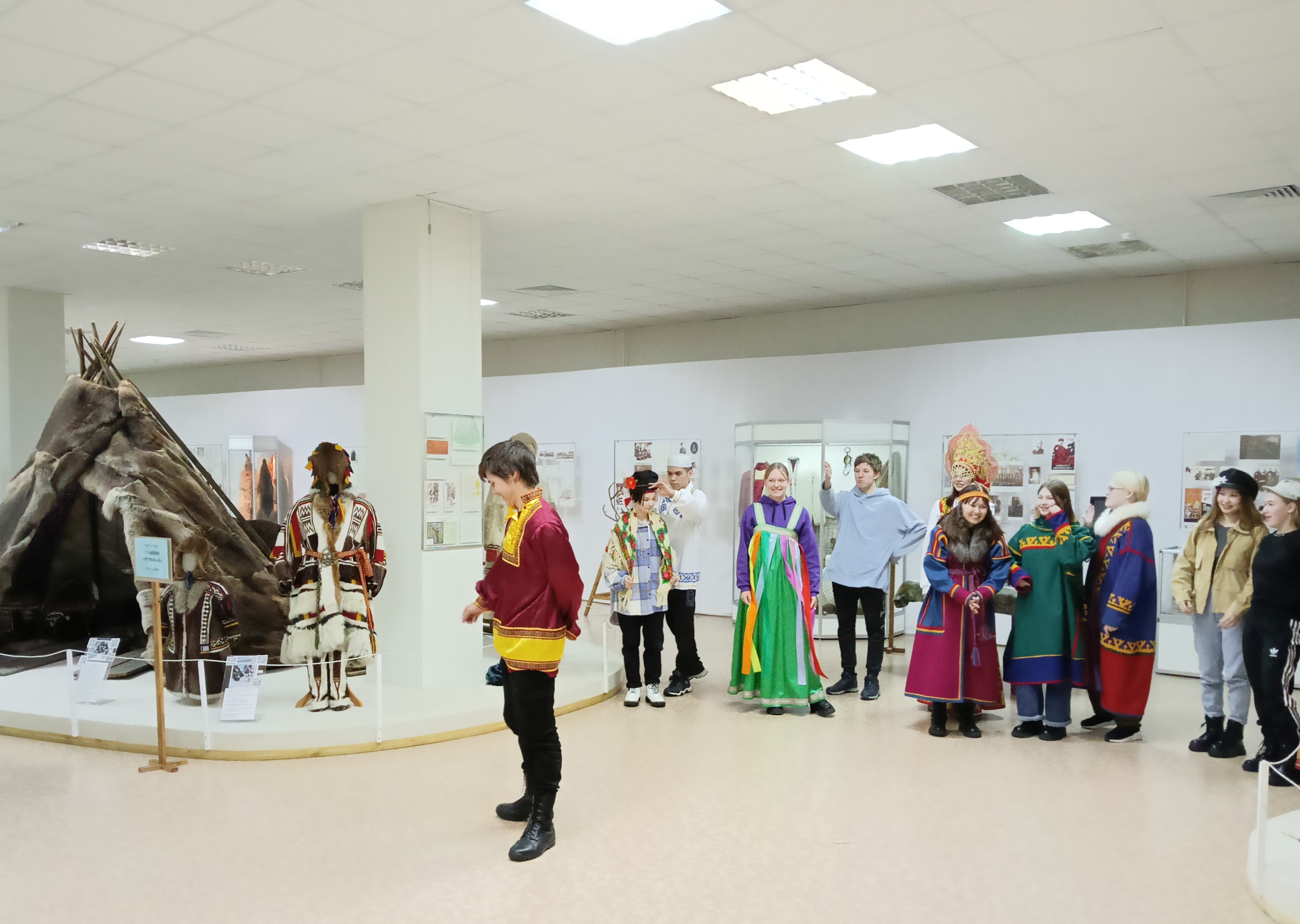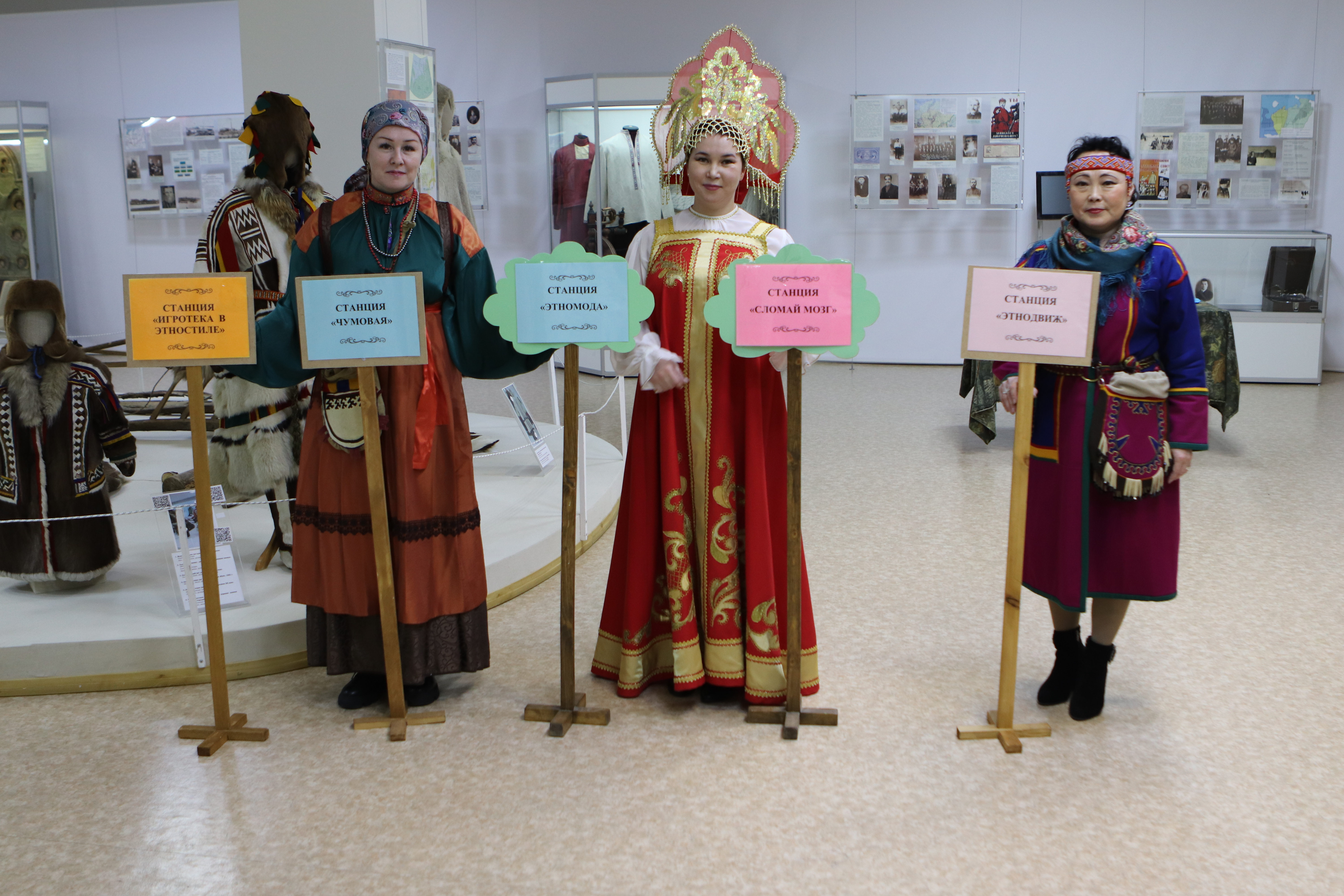 В рамках Международного дня родного языка в краеведческом музее прошла игра-путешествие «Этнокультурная мозаика». Участники прошли по интересному и увлекательному маршруту со станциями, узнав много нового о культуре трёх народов: ненцев, русских и коми. На станции «Радуга дружбы» с помощью ИОЦ «Русский музей: виртуальный филиал» посмотрели видеоролик «Женский народный костюм в России XVIII-XX вв», где познакомились и удивились разнообразию в локальных особенностях покроя и характере декорирования различных элементов одежды.». Построили чум на станции «Чумовая» и поговорили на ненецком языке. «Игротека в этностиле» познакомила с традиционными ненецкими и коми-ижемскими играми с косточками «Поймай оленя», «Перегони упряжку», а под мелодичный звон колокольчика поиграли в «Маленкова» (Жмурки). Станция «Сломай мозг» была связана с великим и могучим русским языком, а точнее с известными фразеологизмами. Участники, посетившие эту станцию, теперь знают, что известное выражение «Злачное место» изначально имело совсем другой смысл, а именно было связано с основной пищей – хлебом. Если на станции «Радуга дружбы» ребята познакомились с большим разнообразием женского народного костюма, то на станции «Этномода» они смогли ее примерить, устроив шикарное дефиле. «Этнодвиж» собрал всех вместе на танцполе в зажигательном флэшмобе под ритмы народной музыки. Участники игры-путешествия «Этнокультурная мозаика» получили массу положительных эмоций, хорошее настроение, а наградой для всех стали новые знания.