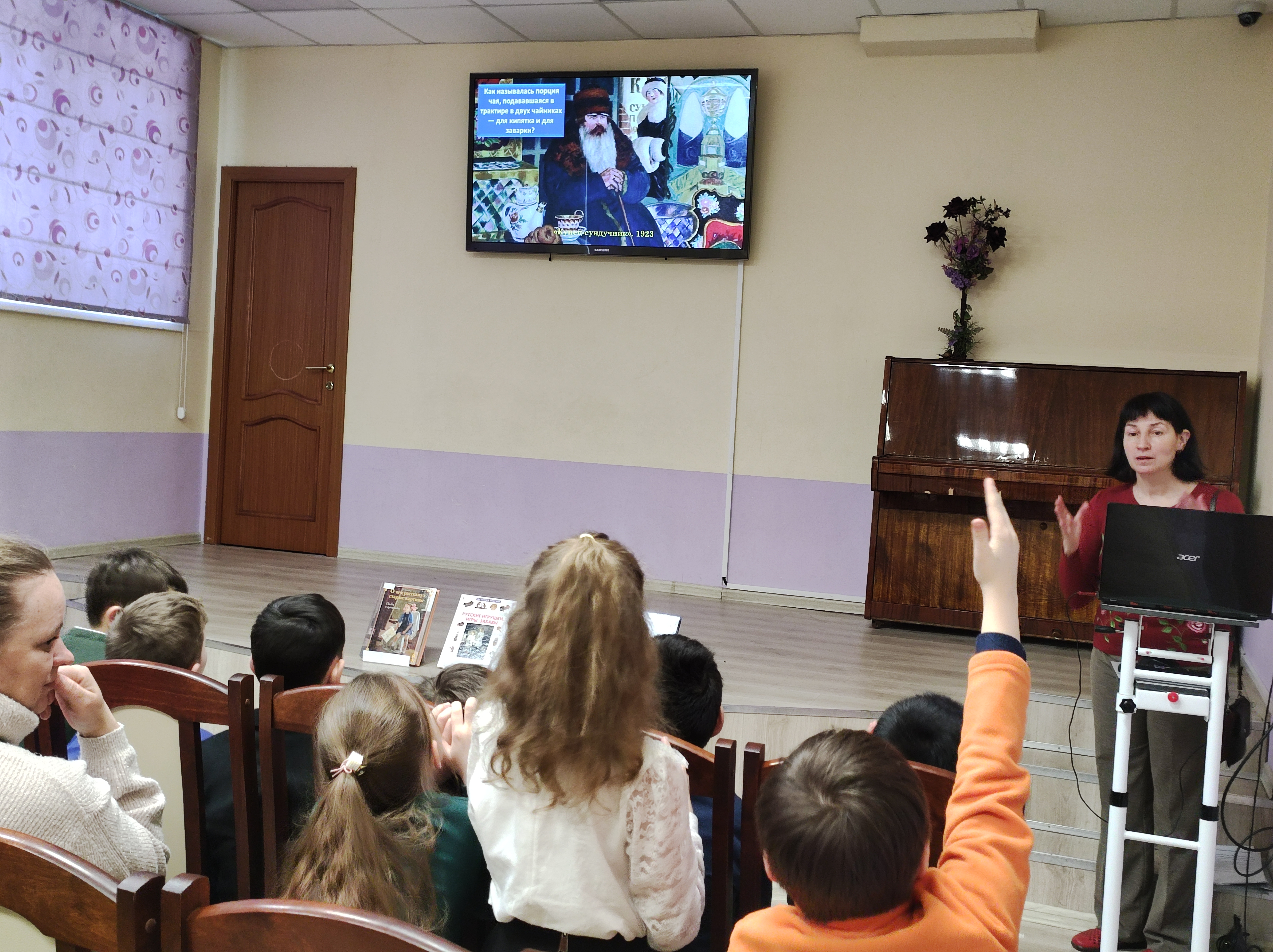 Мероприятие продолжилось в зале искусства, где был накрыт стол, и состоялось чаепитие, во время которого гости посмотрели фильм «Борис Кустодиев» из Медиатеки Русского музея. Также состоялся просмотр слайд-шоу «Масленица в живописи» и знакомство иммерсивной выставкой «Здравствуй, Масленица!». В витринах были представлены книги и экспонаты, а с экрана звучали народные песни и частушки.