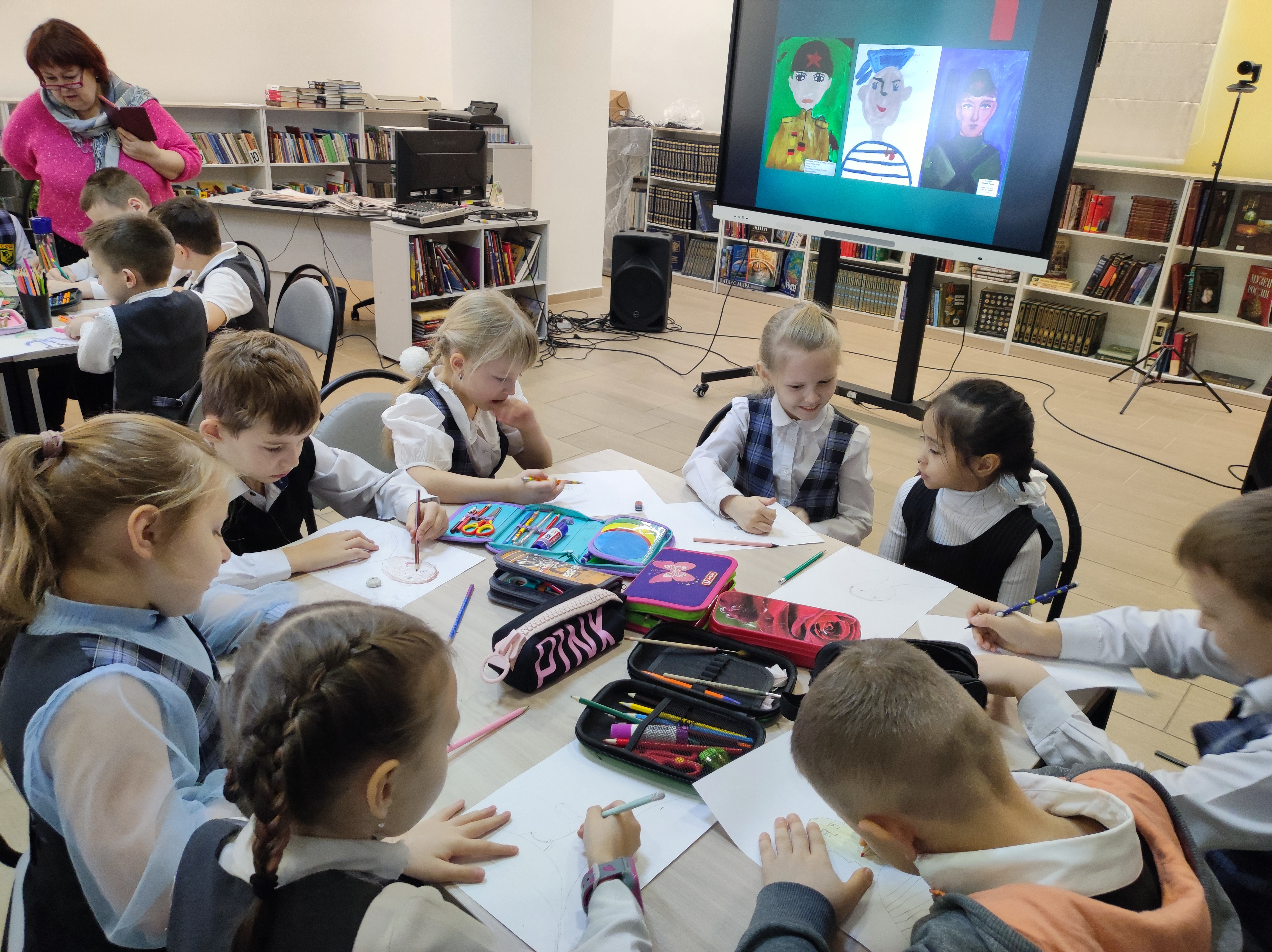 В начале мероприятия ребята узнали историю о празднике 23 февраля. Затем мы вместе посмотрели видеофильм «Портрет» из программы «Русский музей: виртуальный филиал», где очень интересно и познавательно художник вместе с Фафалей учили как правильно рисовать портрет. После просмотра детям было предложено нарисовать портрет солдата. Под песни, посвященные 23 февраля, они активно принялись рисовать. В конце мероприятия ученики познакомились с книжной выставкой «И арсенал, и щит России» и сфотографировались со своими рисунками.