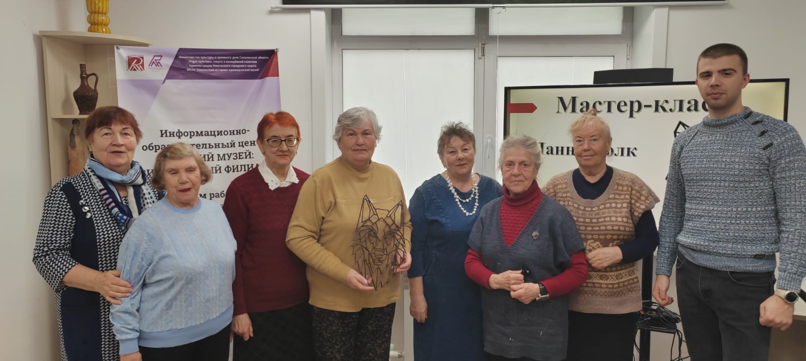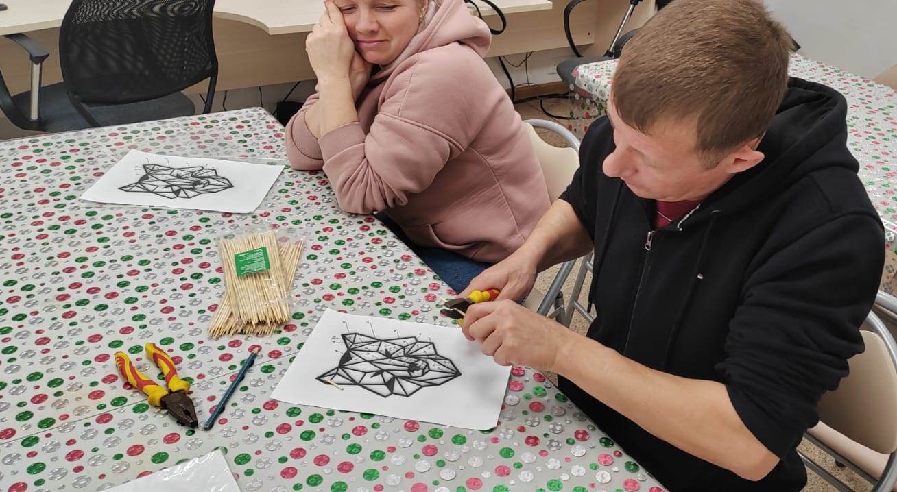 Вдохновившись изображением скульптуры «Волк», которая была создана автором в 1902 году для Императорского фарфорового завода в Санкт-Петербурге, участники изготовили оригинальное декоративное украшение для стены с изображением этого хищника в технике геометрического орнамента, используя деревянные палочки-шпажки.