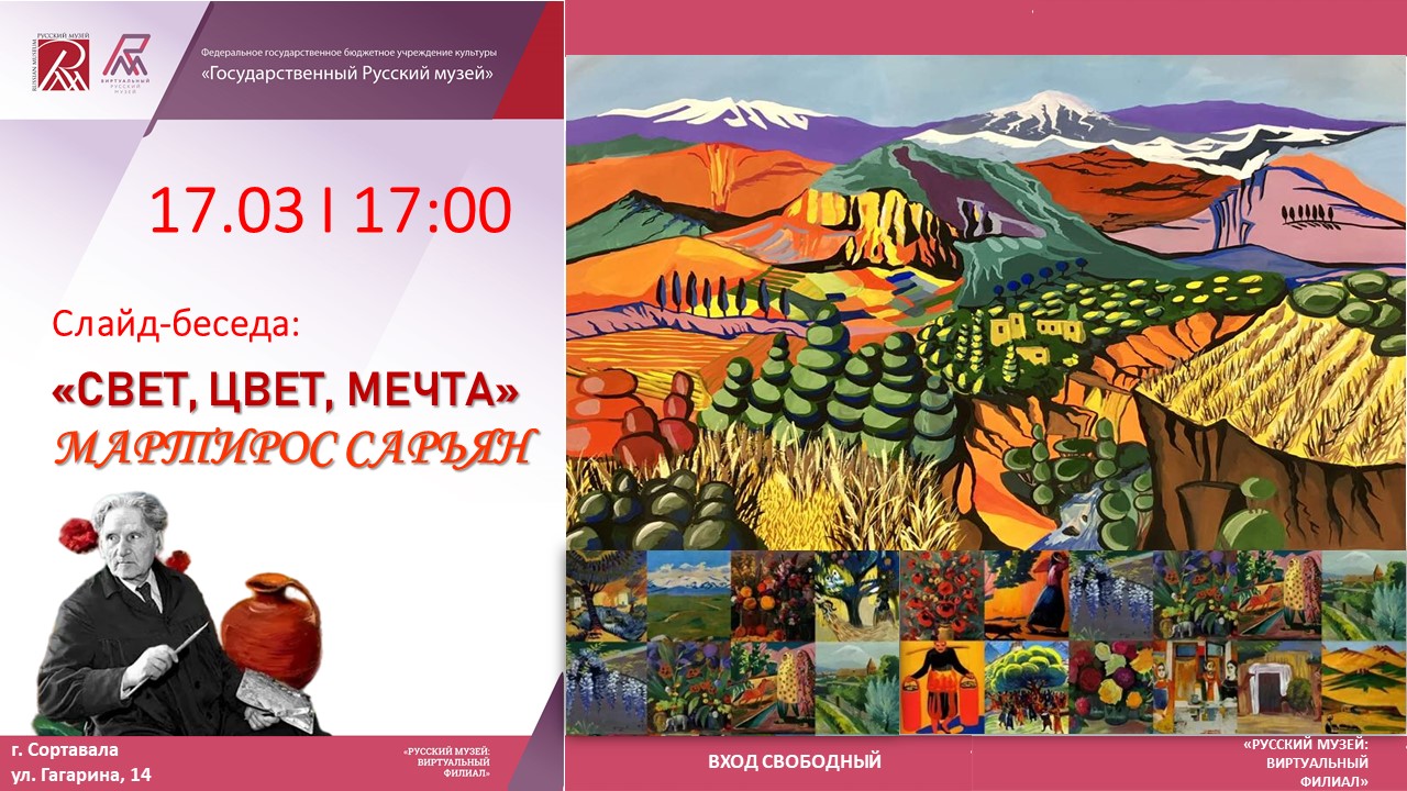 И всвязи с этой даты 17 марта в 17.00 в Виртуальном филиале Русского музея состоялась встреча, посвящённая армянскому советскому художнику-живописцу Мартиросу Сарьяну, в рамках 100 летия со дня образования Союза Советских Социалистических Республик