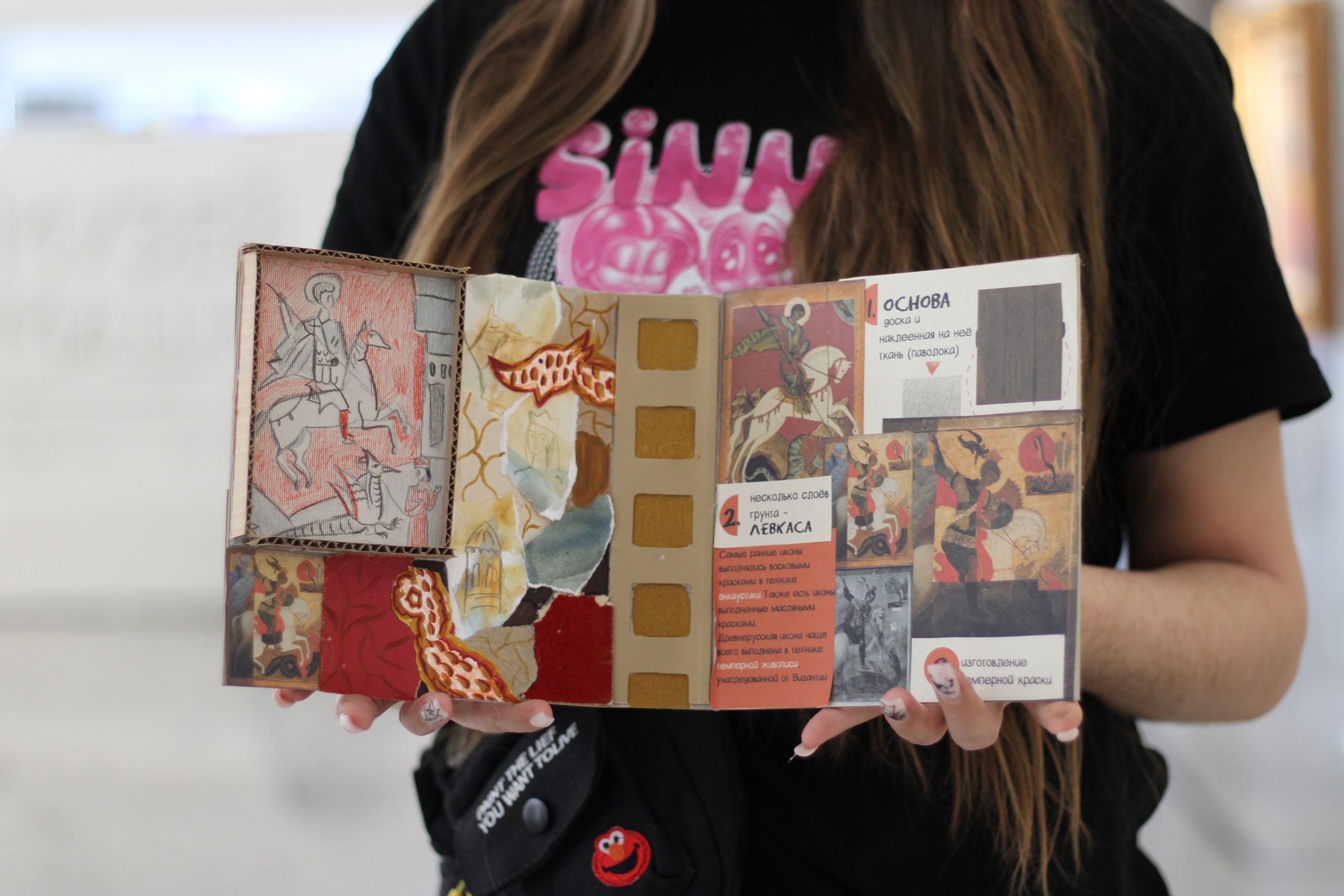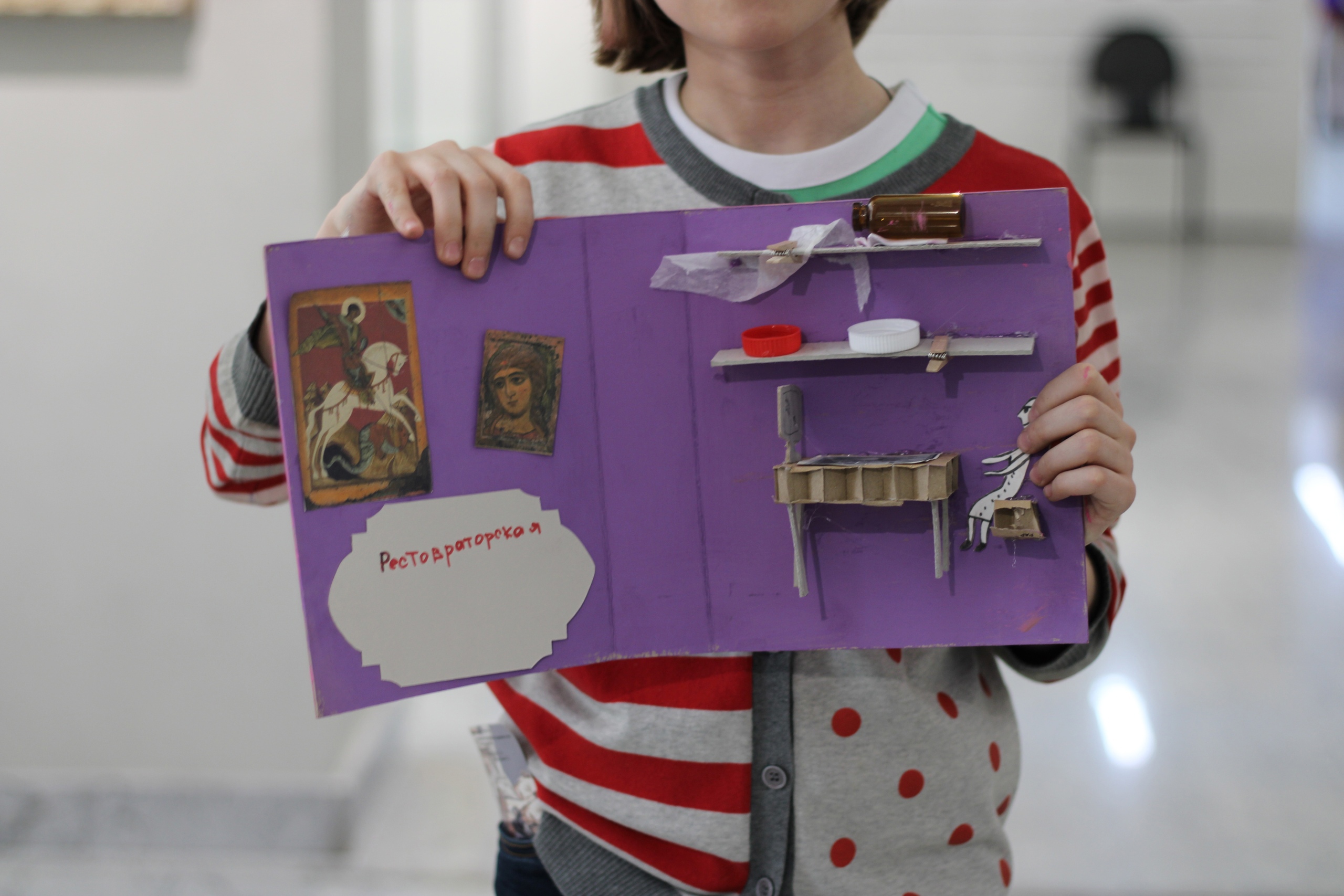 На мастер-классе ребята оформят свои впечатления в объёмный макет, где могут появиться заметки и фотографии о процессе реставрации, полочки с баночками пигментов и клеями. И, конечно, мы поделаем зарисовки по мотивам рассмотренных произведений, например, порисуем героев и змеев-драконов всяких.
