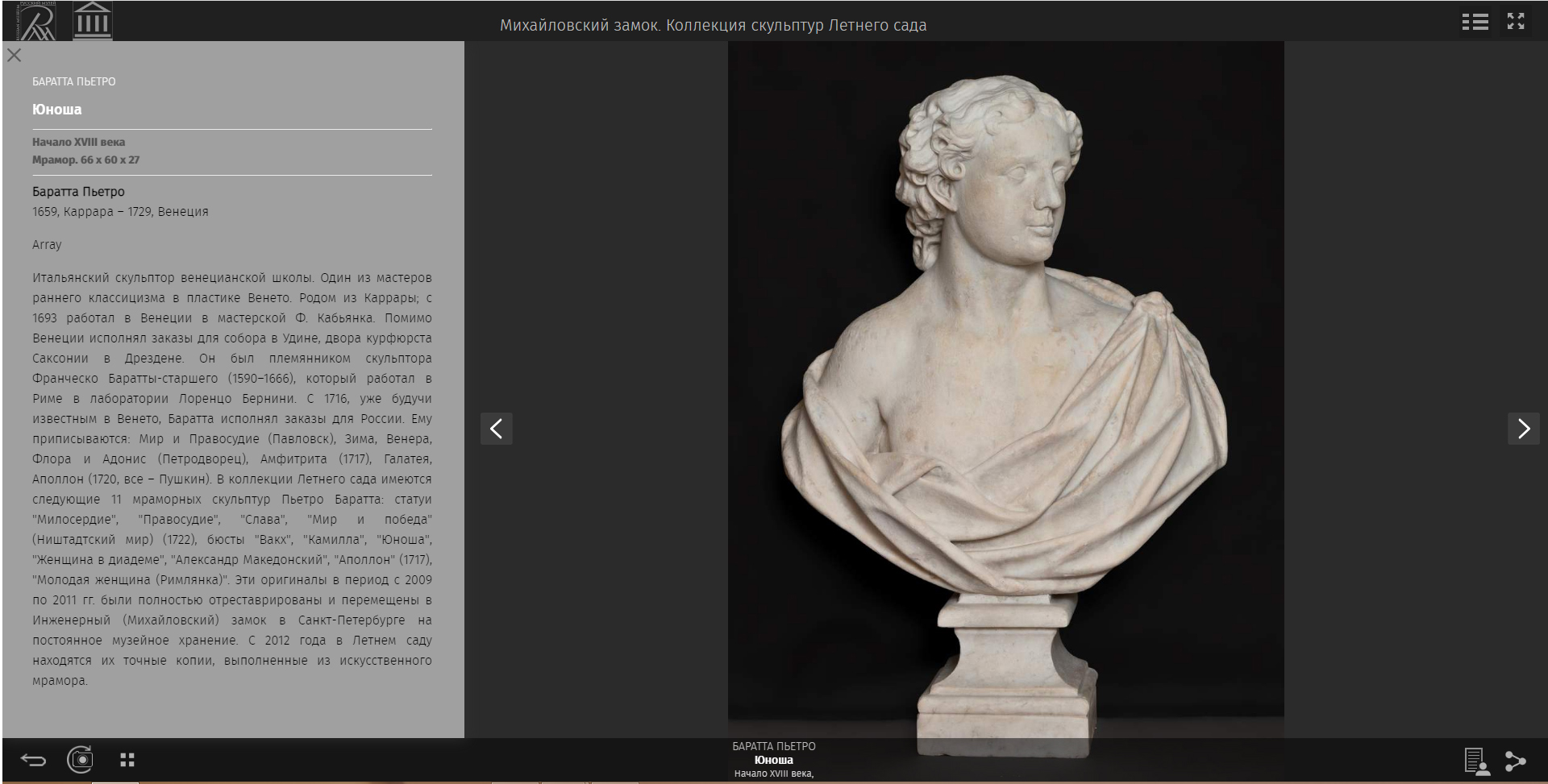 Технологии панорамной съемки переносят зрителя в залы Михайловского замка, где можно детально рассмотреть петровскую коллекцию мрамора и прочитать аннотации, подготовленные по материалам заведующего сектором «Летний дворец и Домик Петра I» Н. Д. Кареевой и хранителя скульптуры Летнего сада, ведущего научного сотрудника Русского музея Г. А. Хвостовой. Дополнительно в тур включены видеоматериалы, в том числе фильм из авторской программы В. А. Гусева «Век Русского музея» – «Летний сад. Перезагрузка», подробно рассказывающий о судьбе скульптурной коллекции Летнего сада и о сложных реставрационных работах.