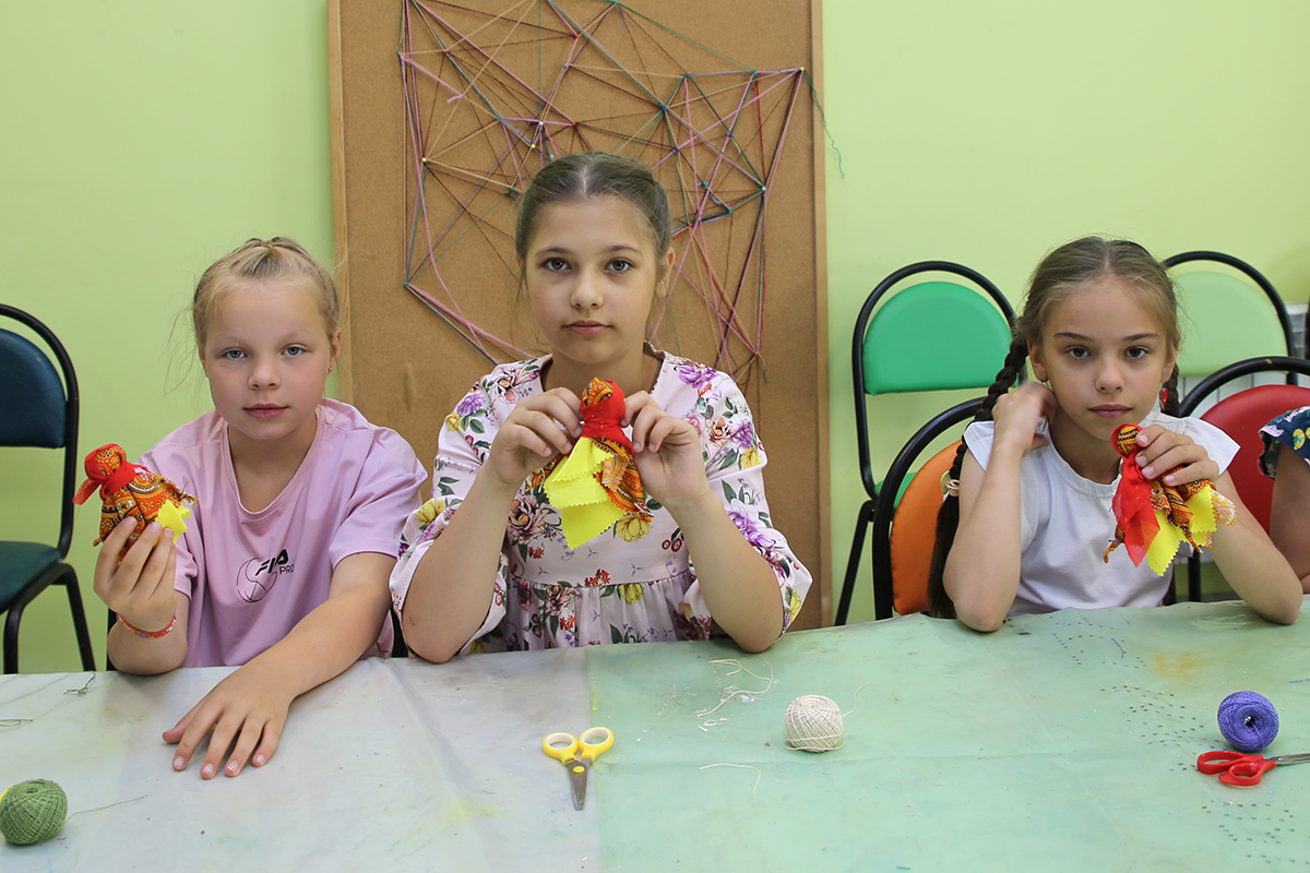 Мастер-классы, которые мы предлагали детям, проводились по теме «Народное творчество». Своими руками ребята сделали куколку-оберег. Перед мастер-классом был показан фильм медиатеки Русского музея «Народное искусство».