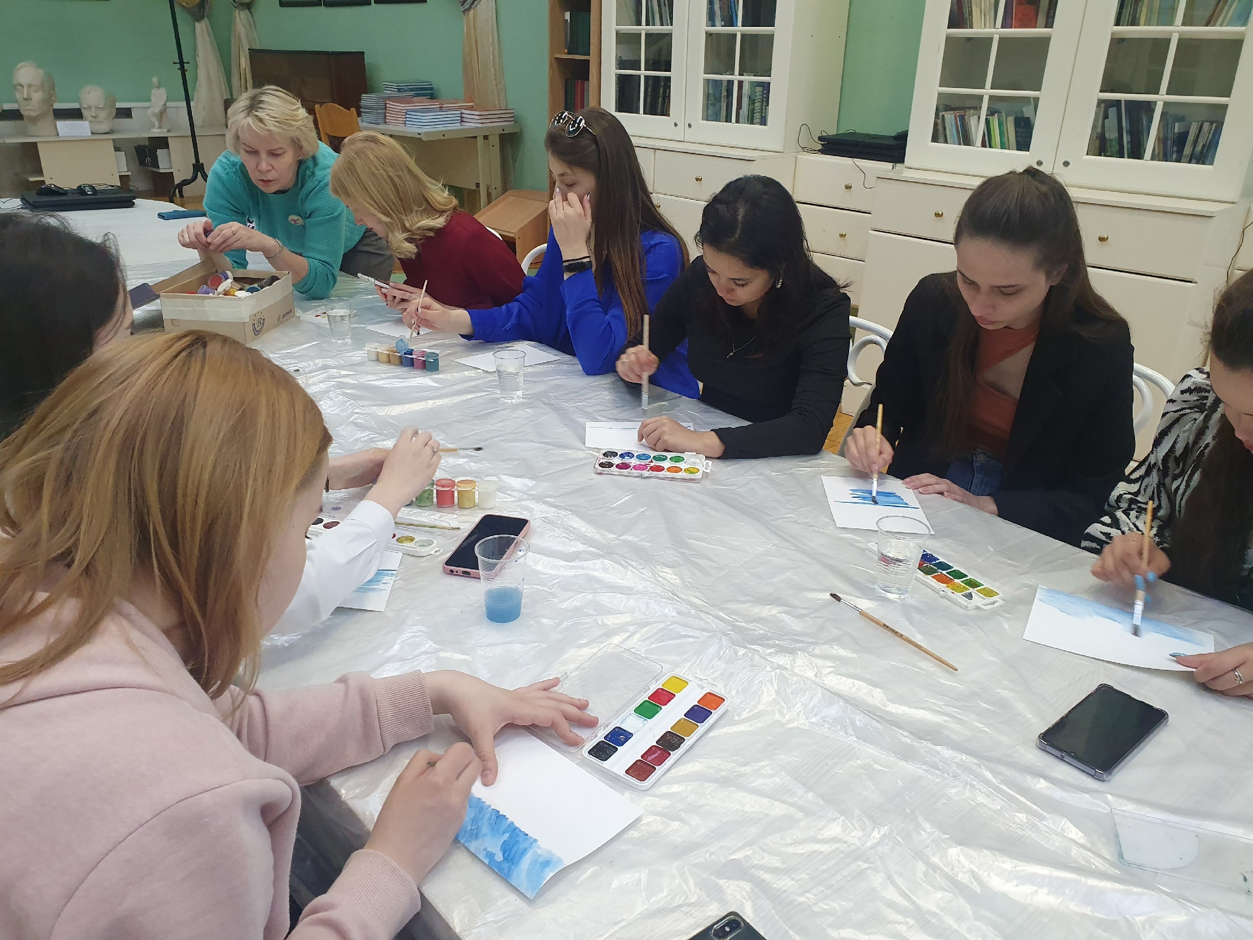 После того, как все вдохновились невообразимо живыми картинами знаменитого мариниста, запустился творческий процесс - студенты сами попробовали себя в роли художников! Рисовали море, бушующее или спокойное, на закате или на рассвете, с сюжетом или без. Такой вид занятия очень понравился нашим посетителям, т.к. будущие воспитатели детских садов могут использовать это в своем профессиональном пути!