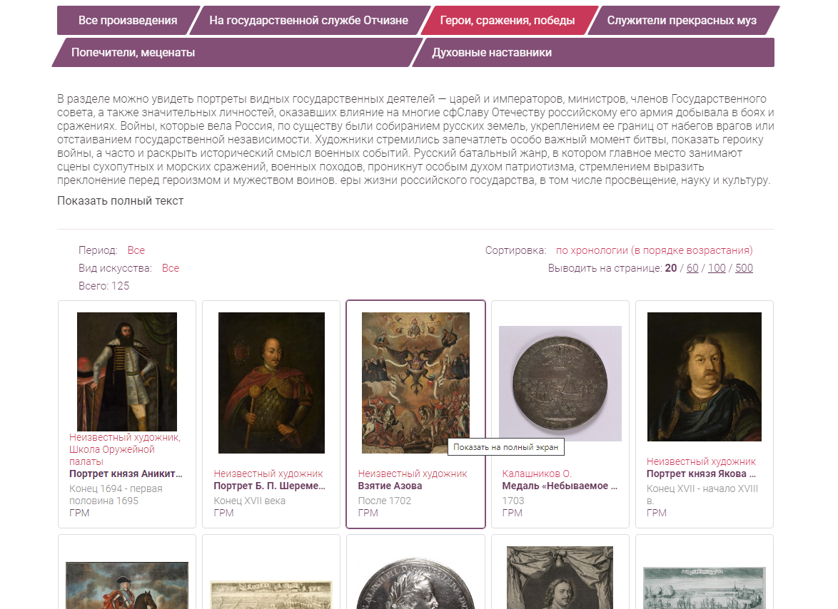 Произведения сопровождаются аннотациями из каталогов Русского музея, а удобный рубрикатор позволяет рассматривать и изучать их в соответствии с темами: «На государственной службе Отчизне», «Герои, сражения, победы», «Служители прекрасных муз», «Попечители и меценаты», «Духовные наставники».