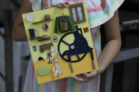На мастер-классе мы работали над композицией мастерской художника. Ребятам был дан силуэт офортного станка, который можно было домыслить (например, сделать подвижным маховик с помощью специальных заклёпок – брадсов), дорисовать мелкие детали или вовсе придумать свой механизм. Из полосок картона мы мастерили объёмные полки и наполняли их всякими материалами полезными: рулонами бумаги, книгами, склянками с кислотами, красками и маслами, а также место нашлось для милых питомцев и вещиц.