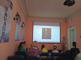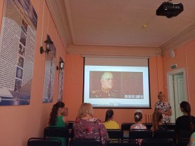 Из коллекции Русского музея гости виртуального филиала рассмотрели портрет Маршал Советского Союза Жукова Георгия Константиновича, созданного П.И. Котовым в 1945 году. Художник создал портрет в период, когда Жуков занимал должность главнокомандующего группой советских войск и главы советской военной администрации в Германии. Маршал позировал художнику шесть сеансов по полтора часа. Выразительность облика легендарного военачальника, командующего Курской битвой, произвела большое впечатление на подростков.