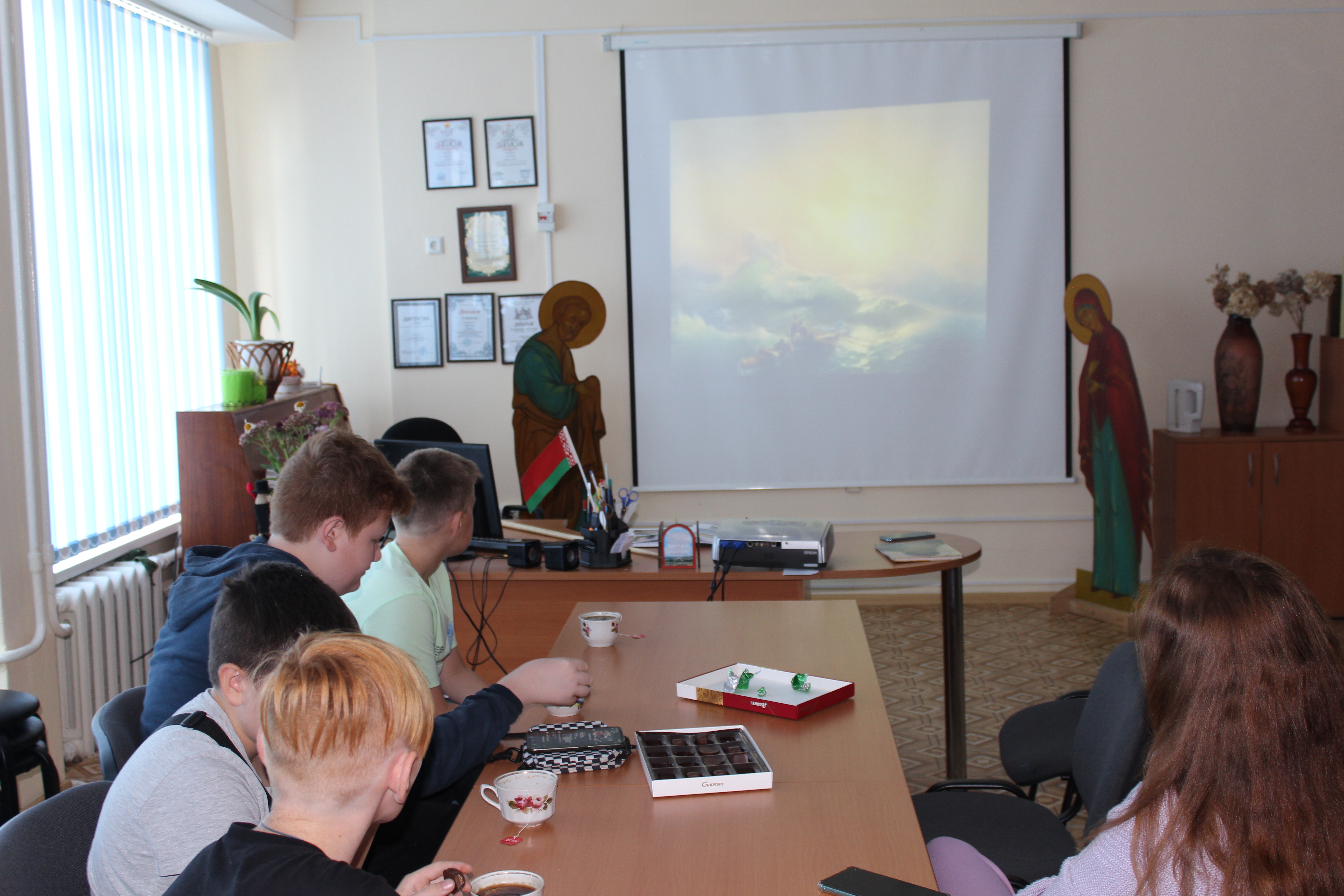На мастер - классе для ребят был продемонстрирован фильм " Курс. " Я и картина". Две бури". Школьники могли окунуться, благодаря виртуальной экскурсии по кртинным галереям Русского музея, и познакомиться с творчеством Ивана Айвазовского.