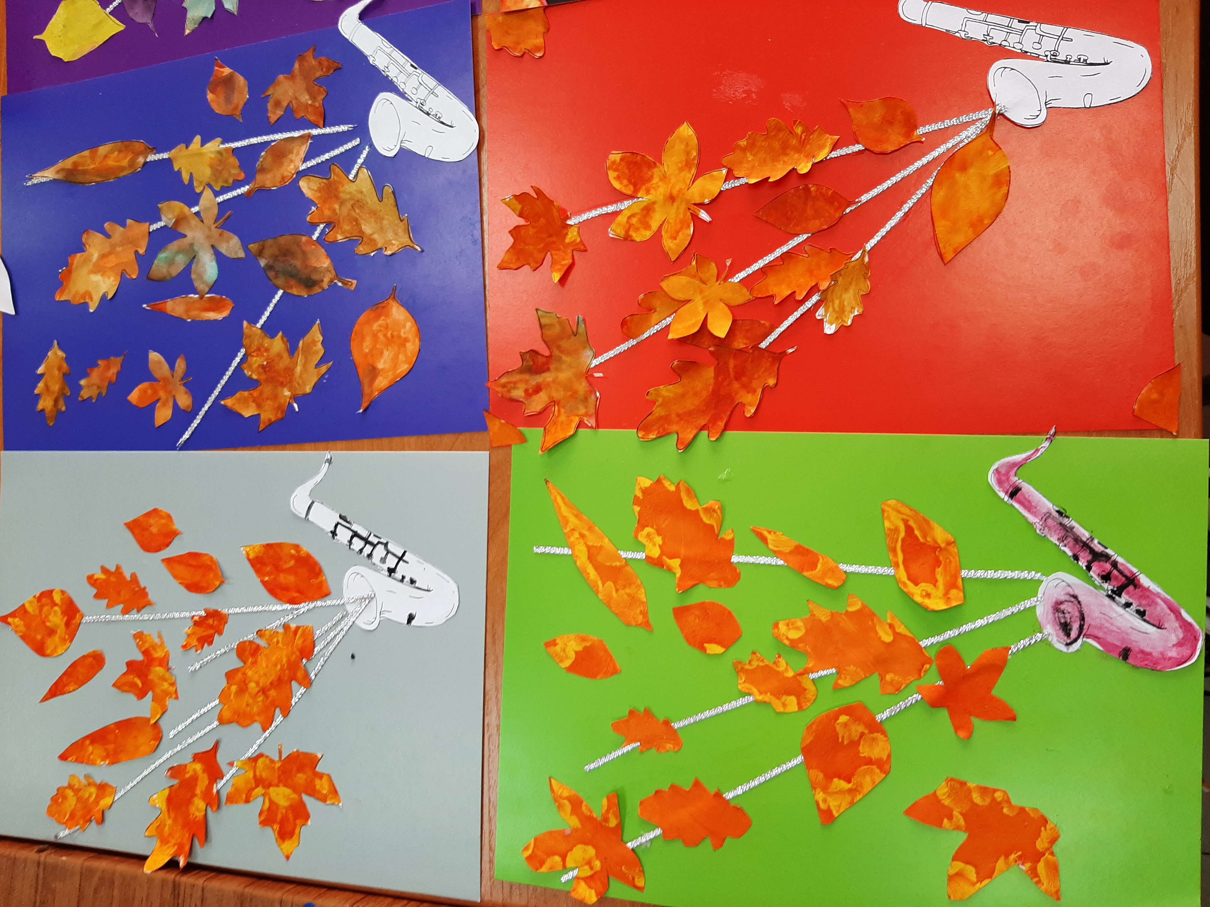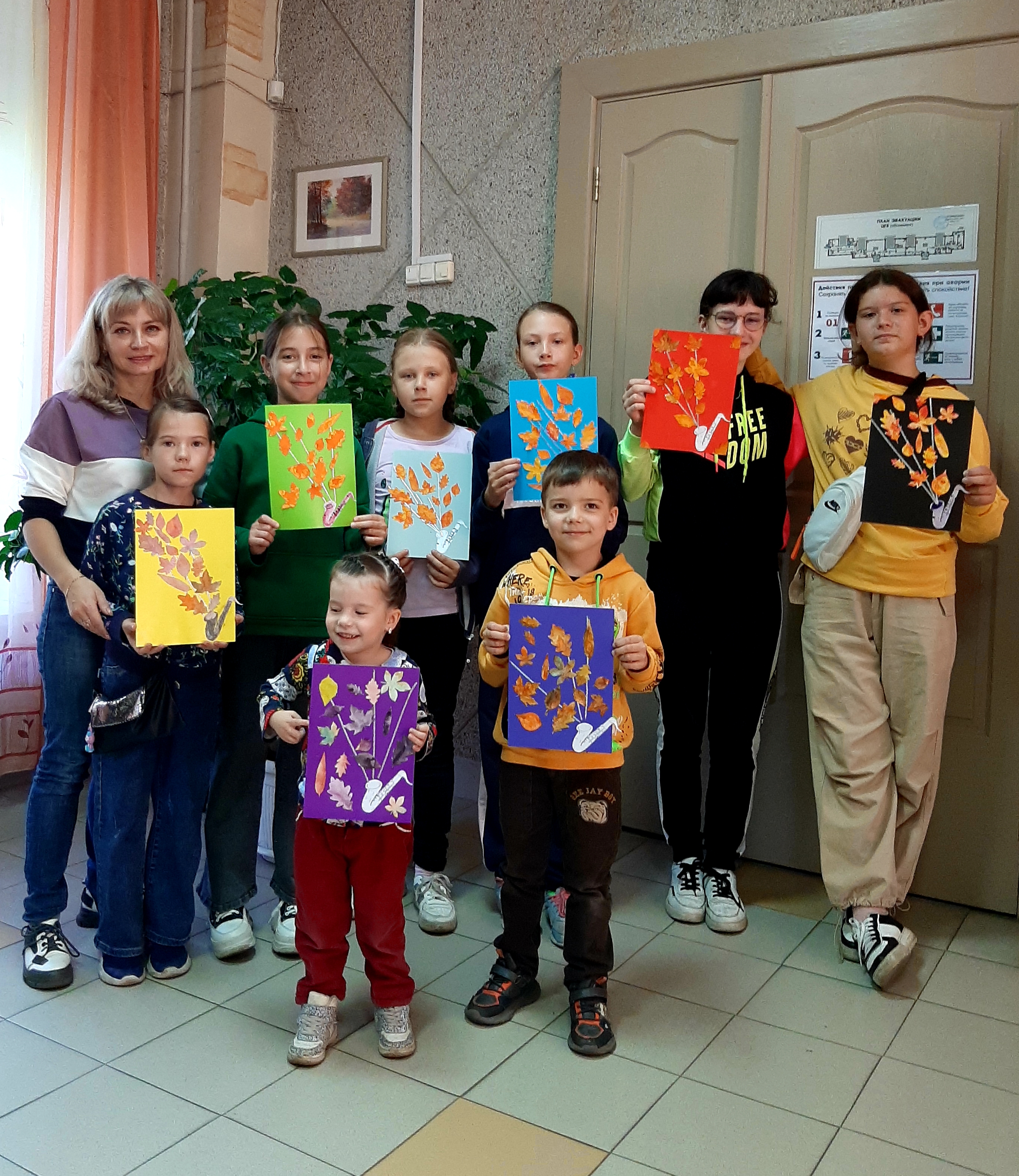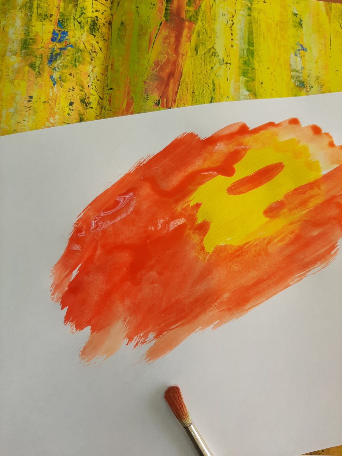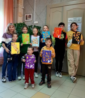 Затем ребята создали свою арт-хаосную композицию, используя красный, оранжевый, желтый, зеленый цвета. Палитра осенних красок впечатляла! Работу подсушили, вырезали листочки, сделали аппликацию. Творческий процесс был увлекательным и насыщенным!