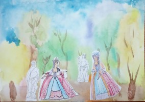 Дети нарисовали прекрасный сад и наполнили его гуляющими придворными