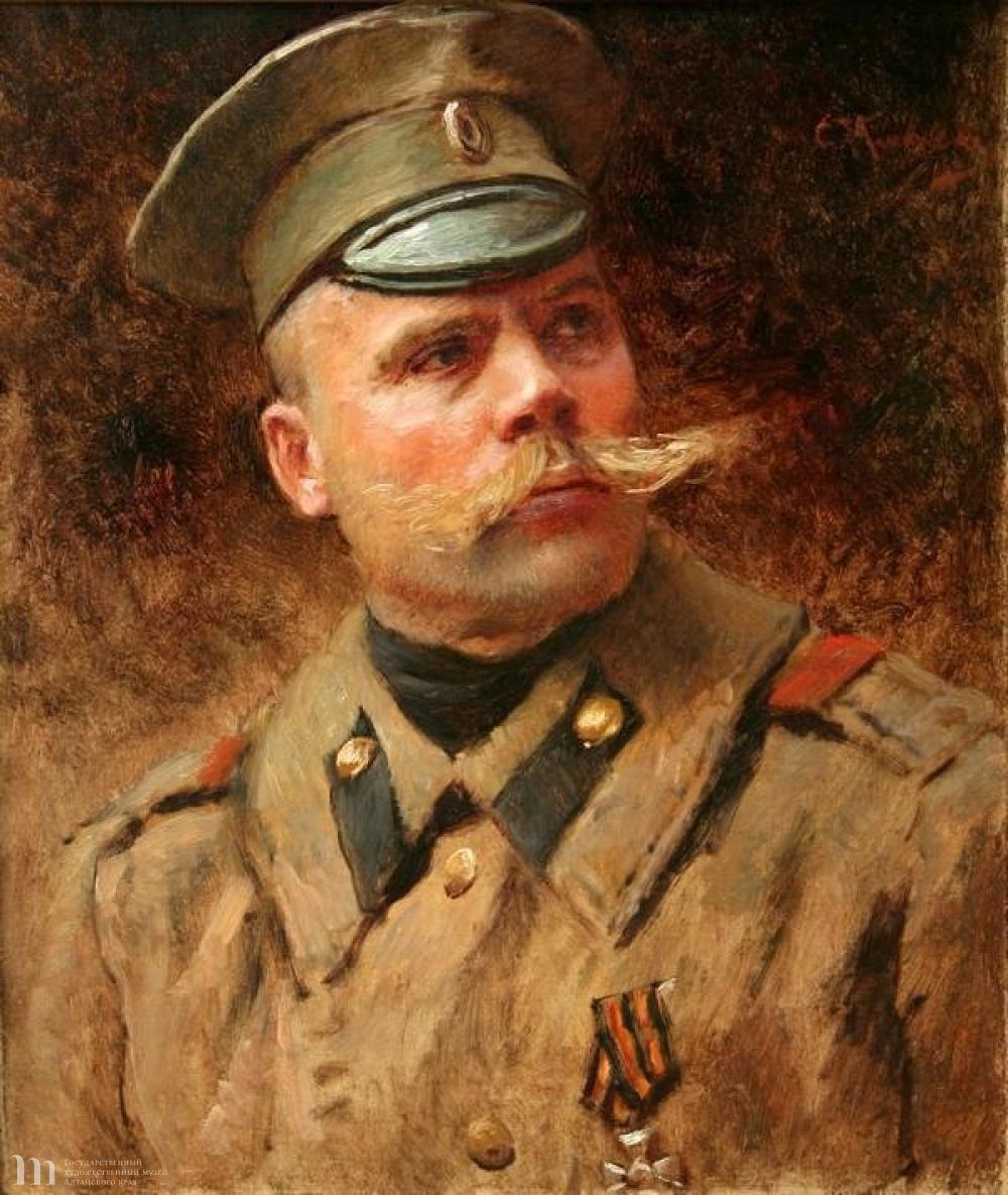 В работе «Унтер» Константина Егоровича Маковского (1839-1915) изображён простой солдат. Энергичный поворот головы, решительный взгляд, пушистые, лихо подкрученные усы говорят о храбрости и удали модели, то есть о тех качествах, какими в идеале и должен обладать русский солдат, защитник Отечества.