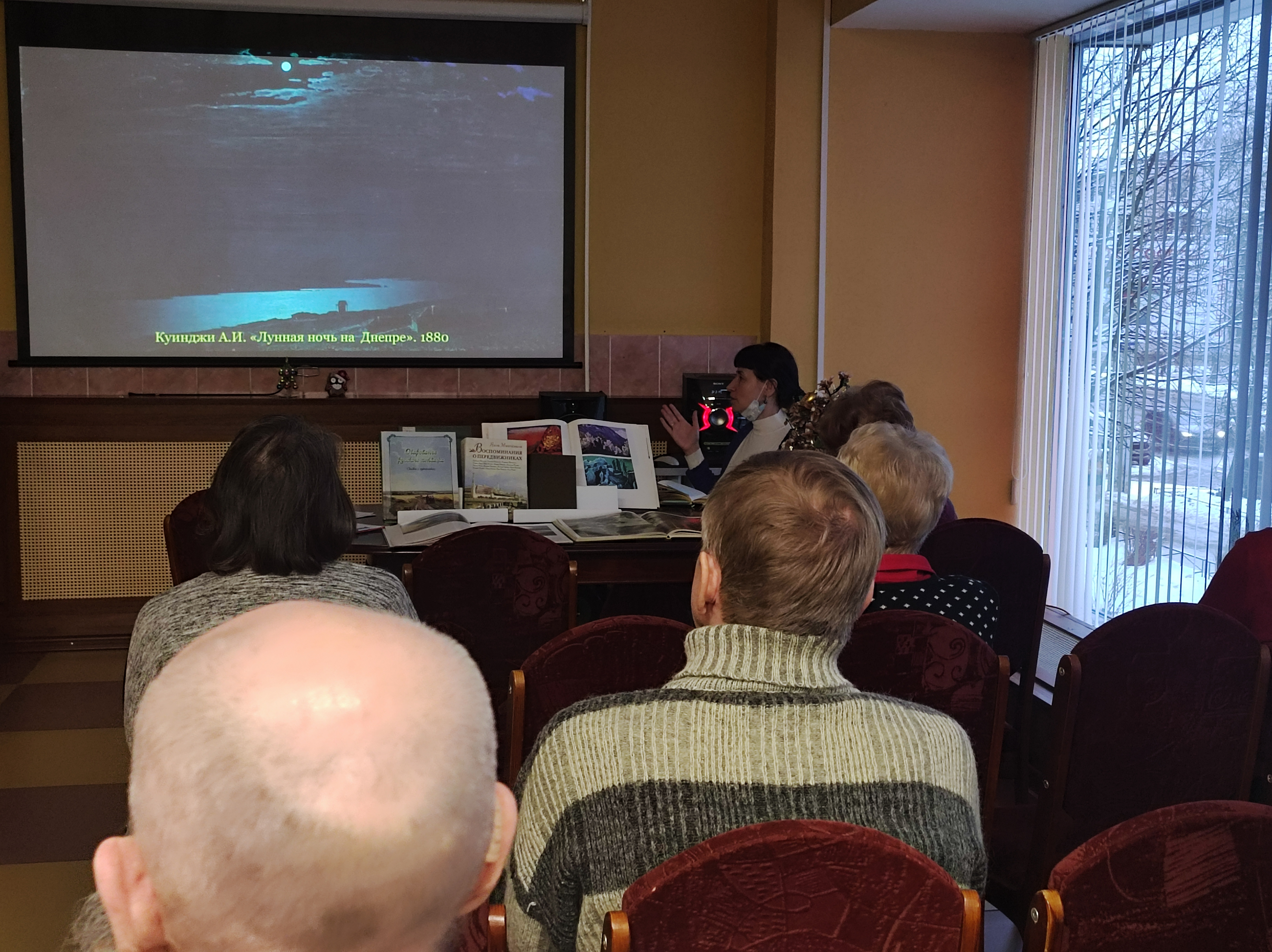 Прошла лекция "Художник света Архип Куинджи", посвящённая творчеству русского художника, мастера пейзажной живописи, для которого характерны были многочисленные «солнечные» картины и эскизы. Особый путь автора в искусстве определило полотно «Украинская ночь», с которой Куинджи начал свою «погоню за светом» —  стремление достичь полной иллюзии естественного освещения. В наивысшей степени это проявилось в картине «Лунная ночь на Днепре» со сверкающей лунной дорожкой, прорезающей бархатную тьму.